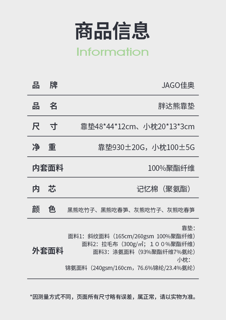 佳奥 胖达熊靠垫 240603J0100MW2+240603J0100SG10(单位:套) 白色
