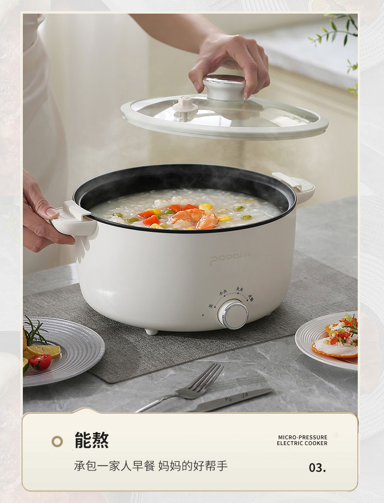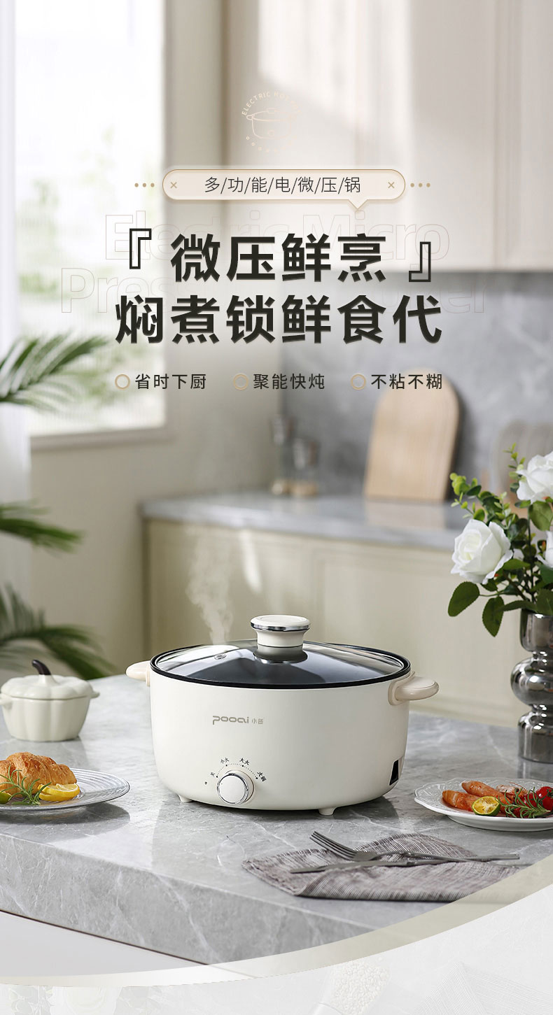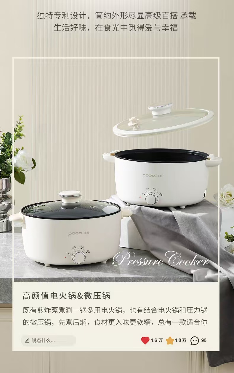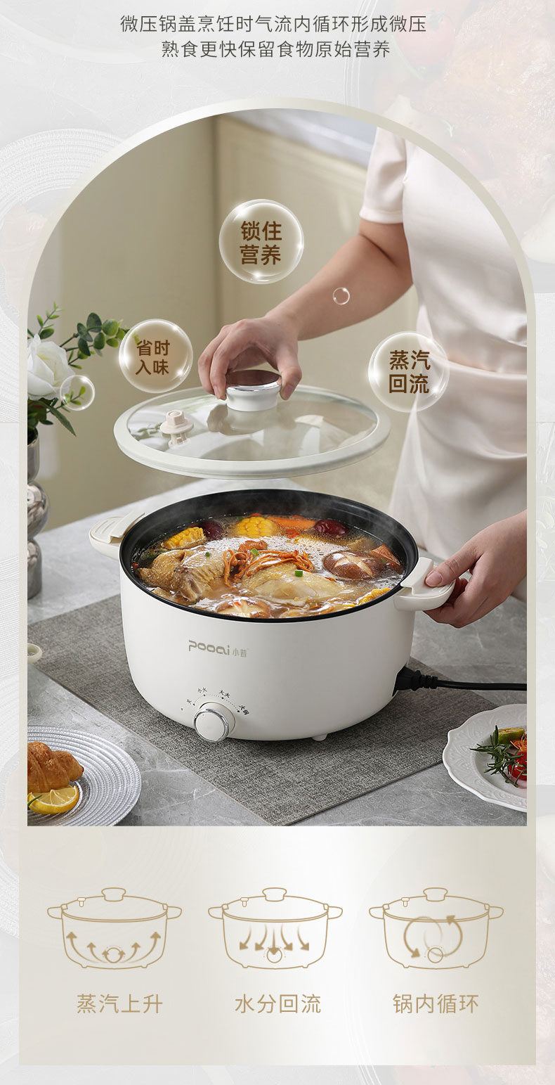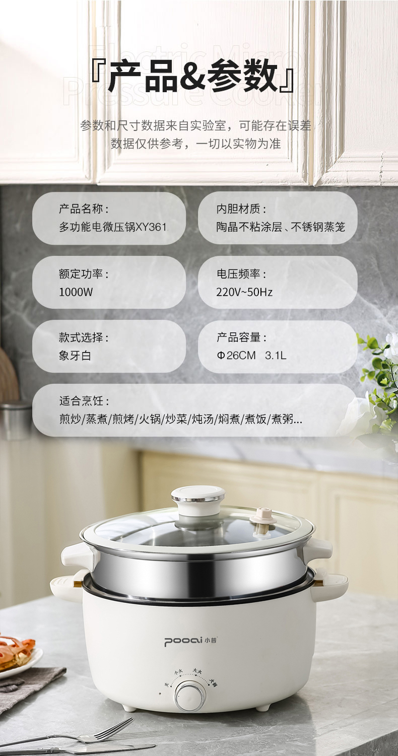 小普(POOAI)多功能电微压锅XY361,3.1L电火锅 带蒸笼*1(单位:台) 白色