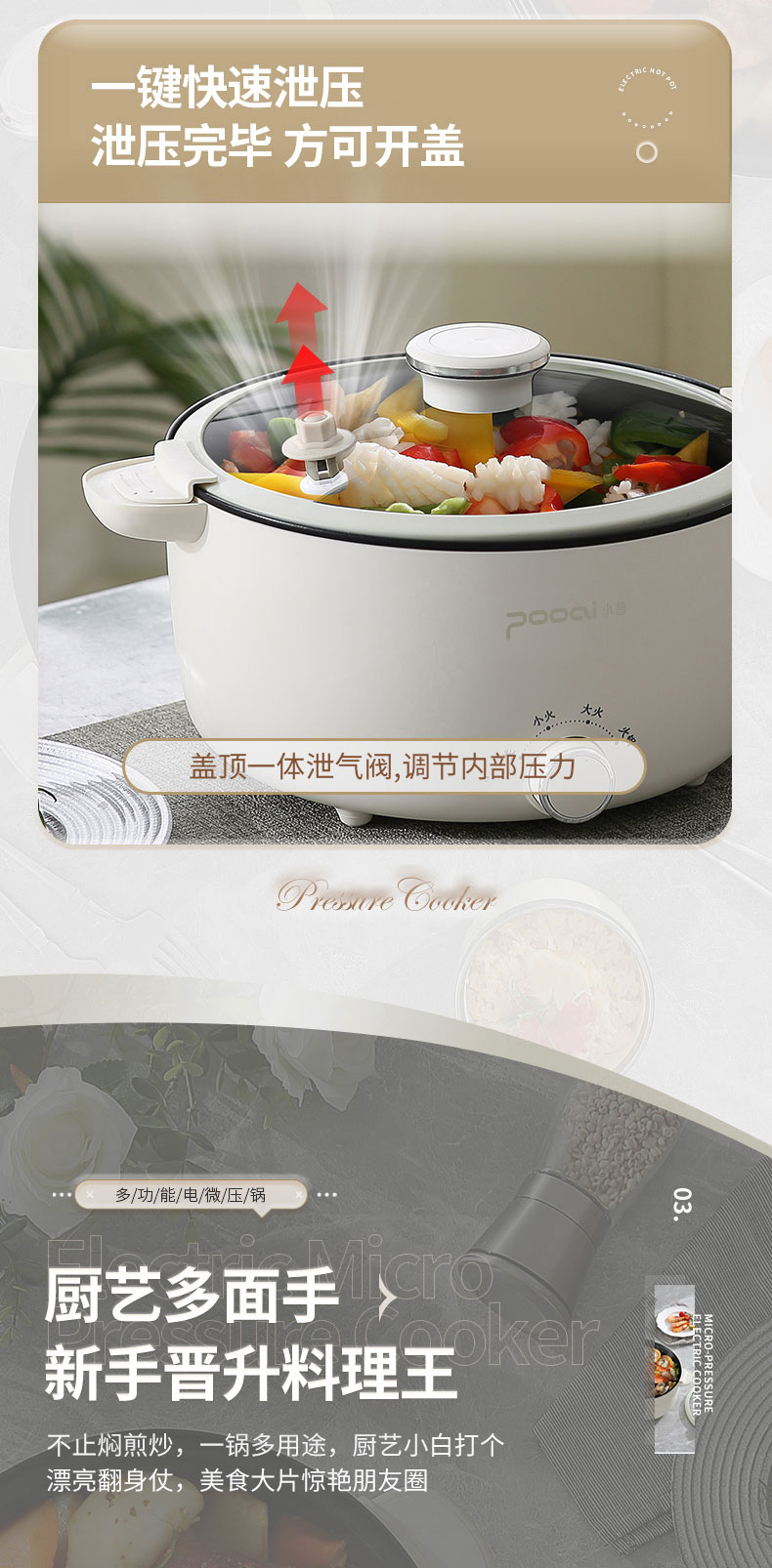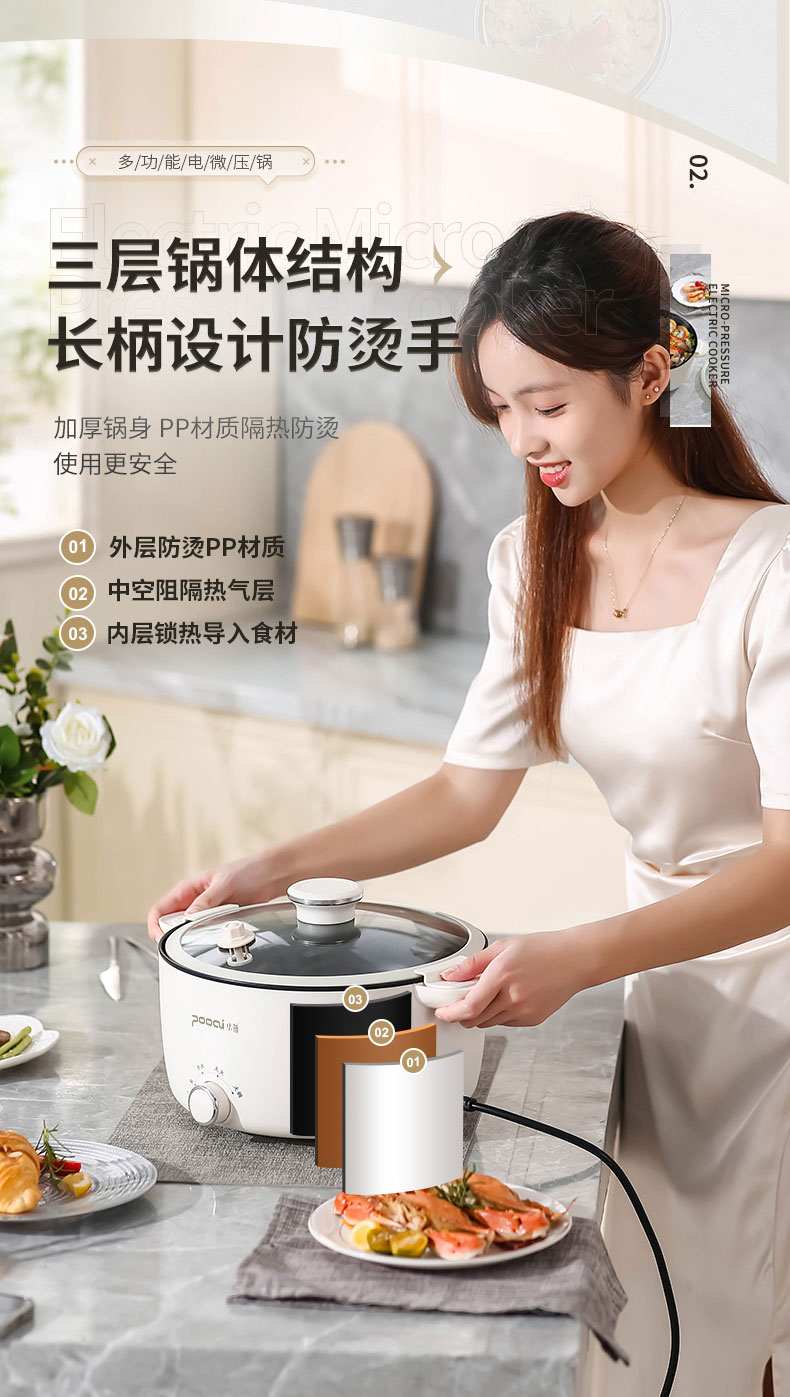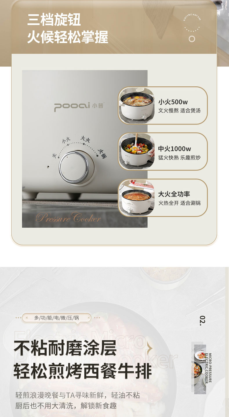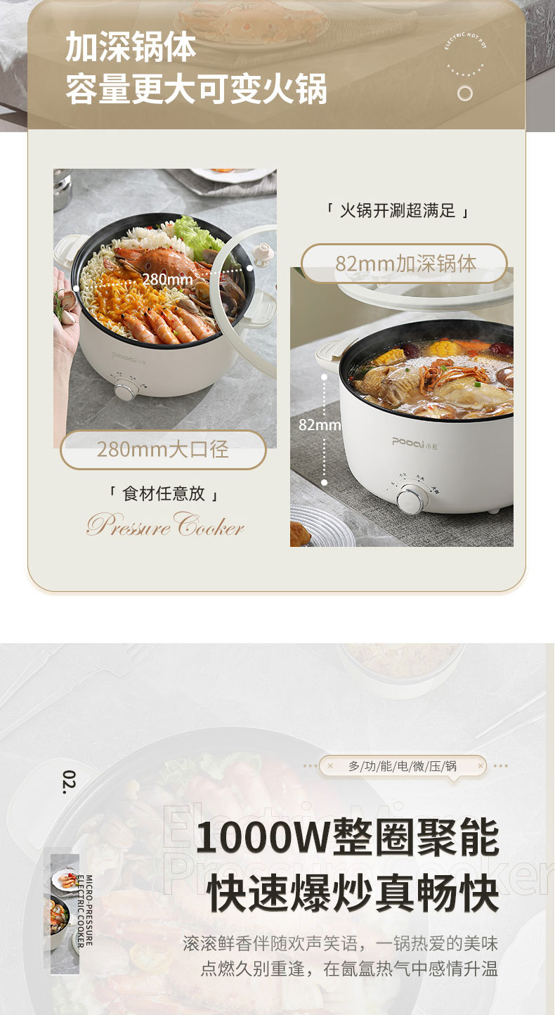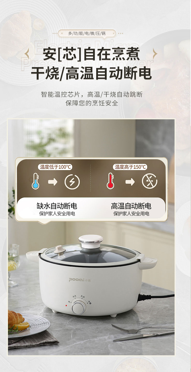 小普(POOAI)多功能电微压锅XY361,3.1L电火锅 带蒸笼*1(单位:台) 白色