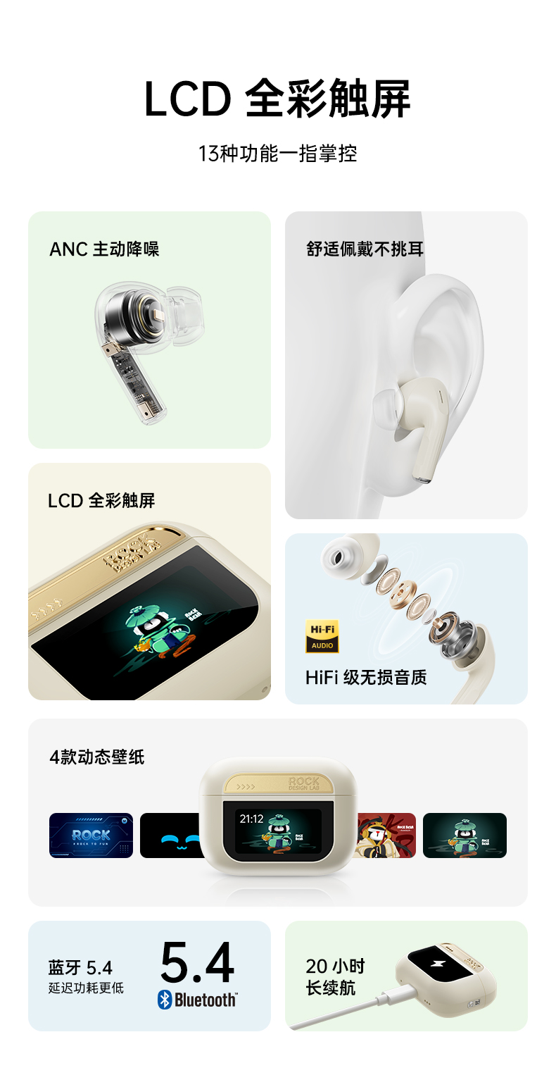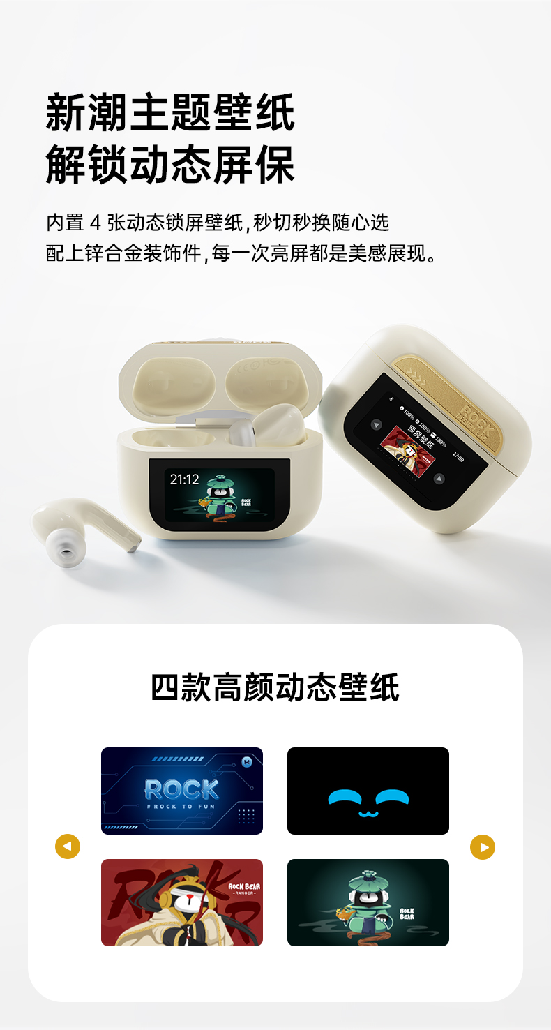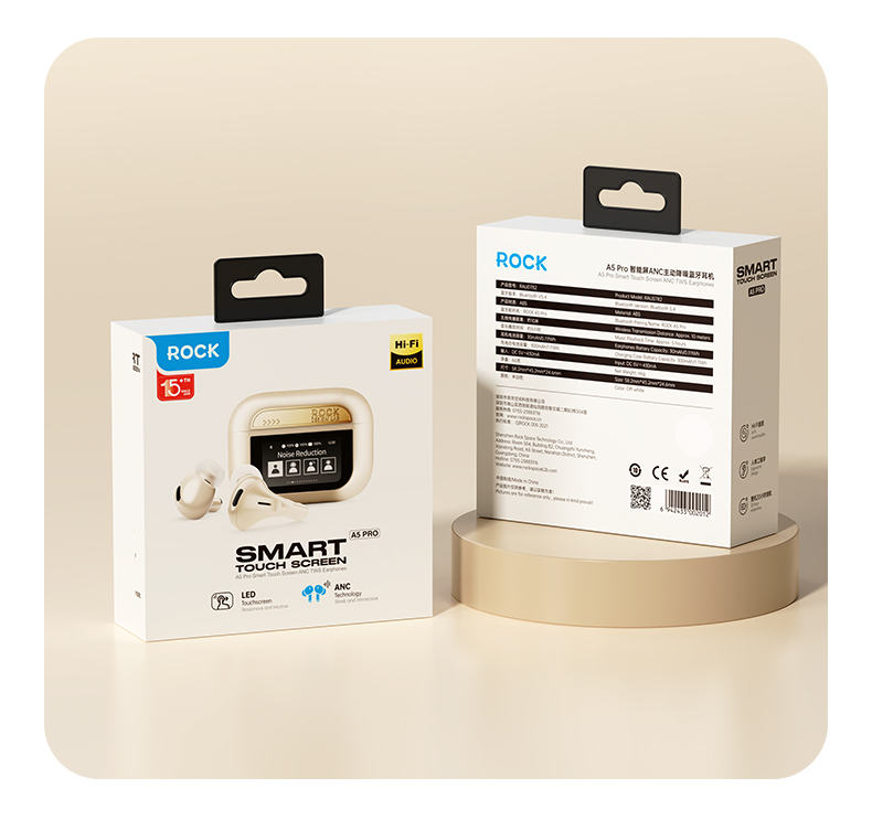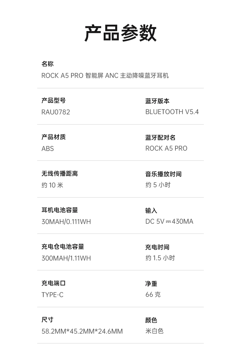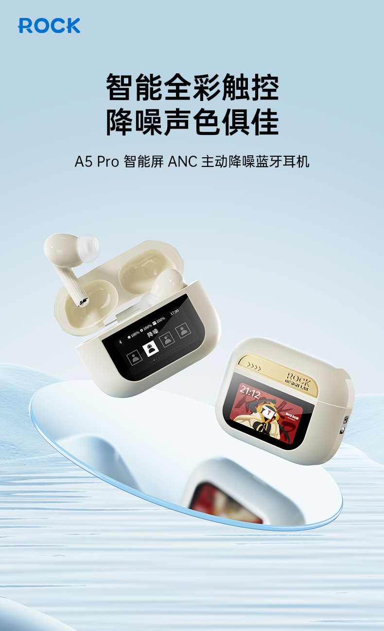 ROCK RAU0775 A5 Pro 智能屏ANC主动降噪蓝牙耳机 米白色(单位:个) 米白色