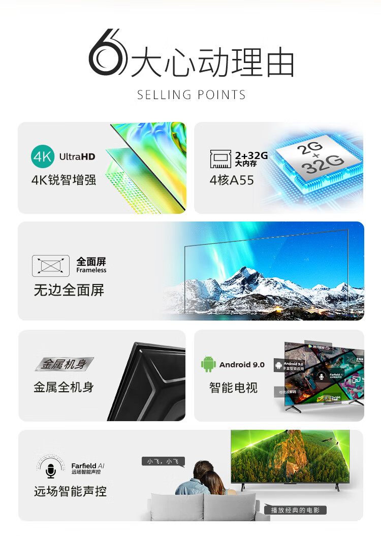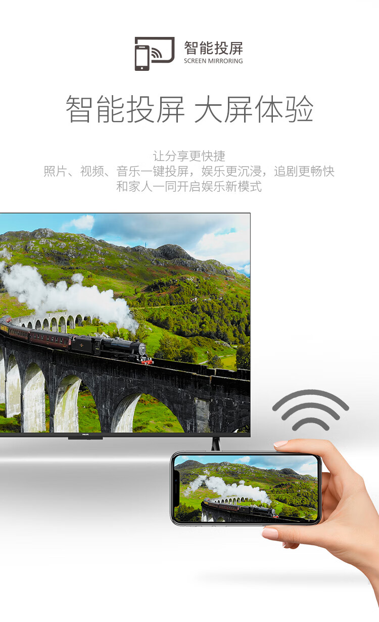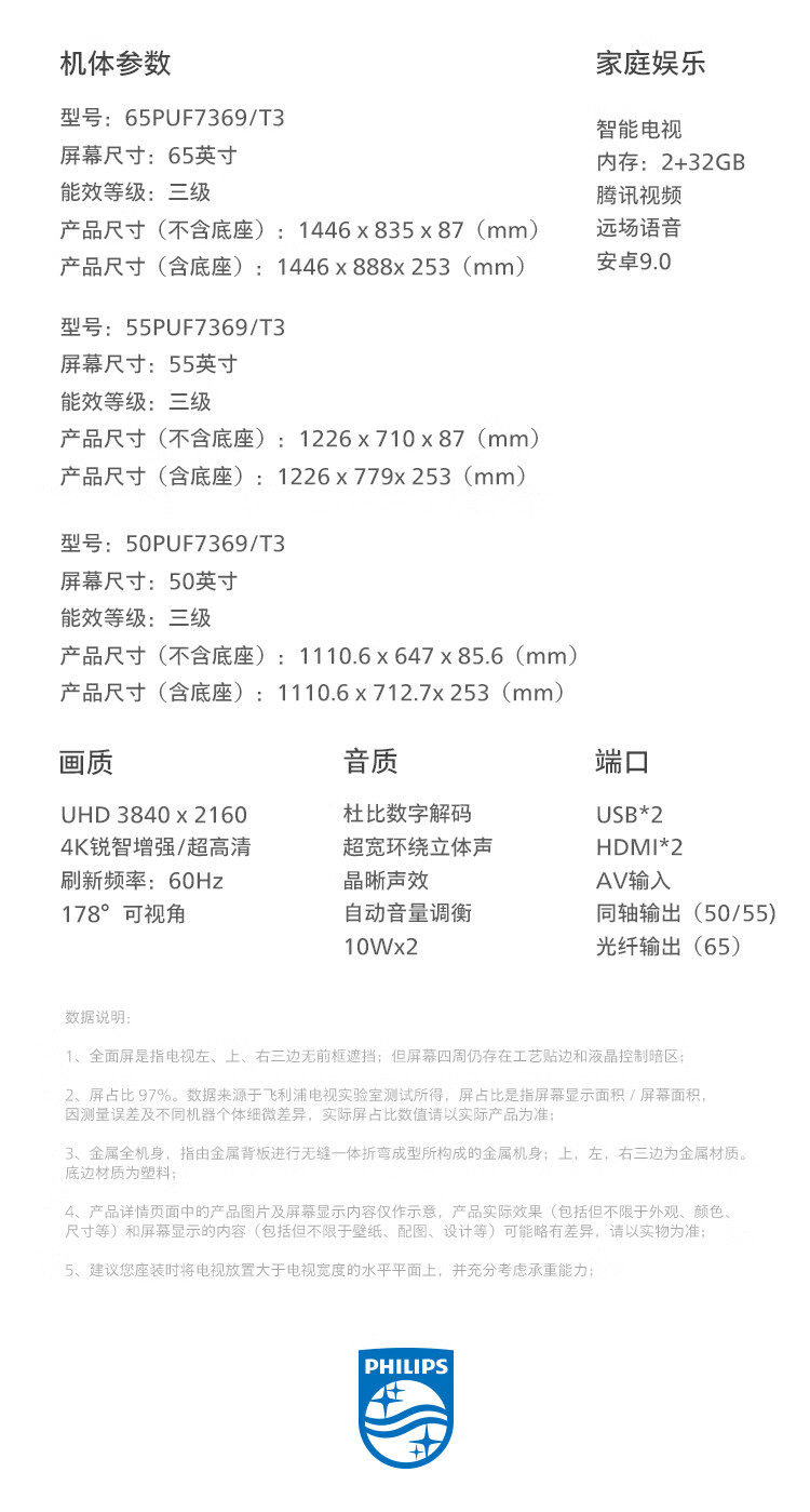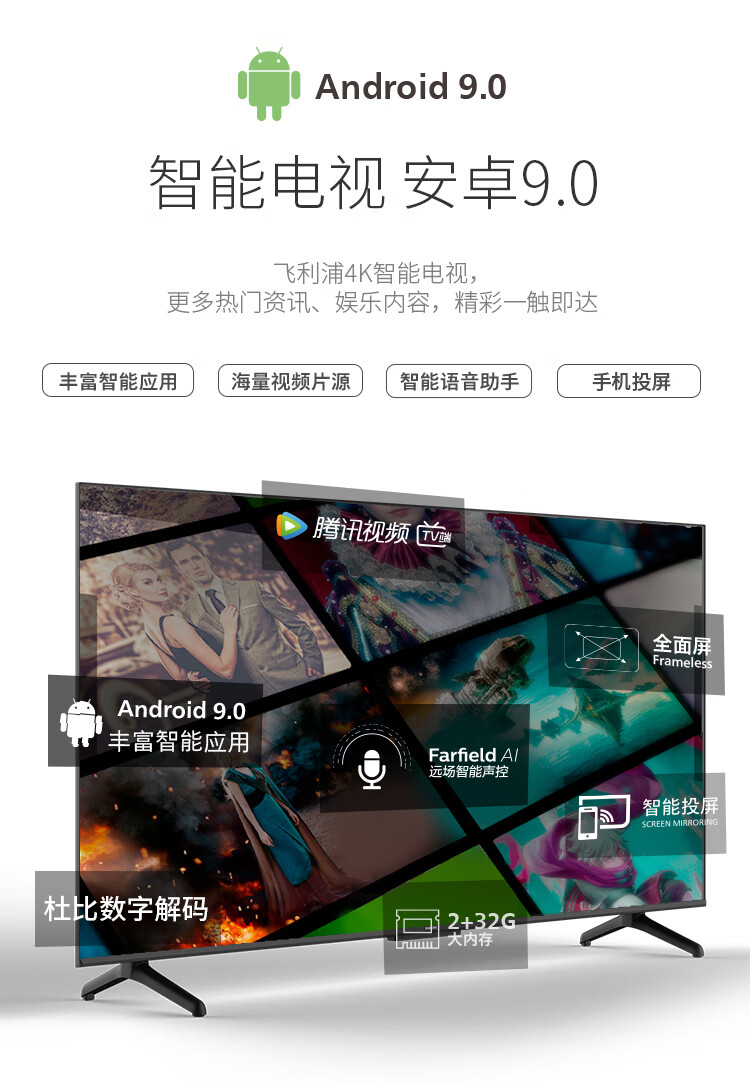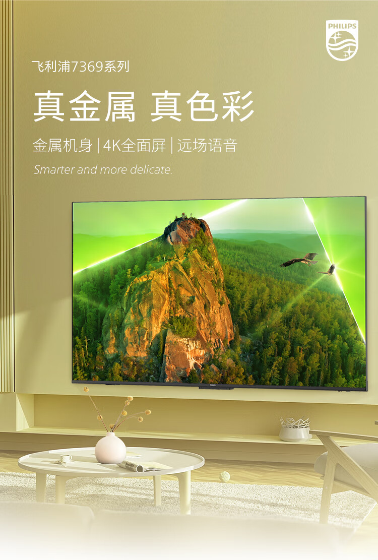 飞利浦50英寸4K超高清2+32G金属机身网络智能语音液晶平板电视机0PUF7369/T3单位:台 黑色