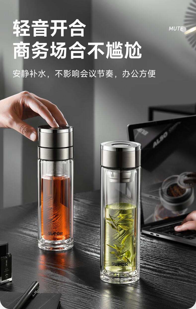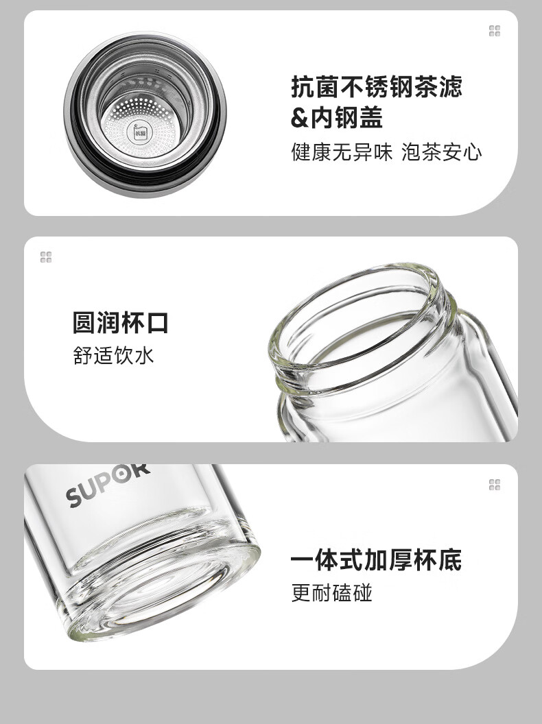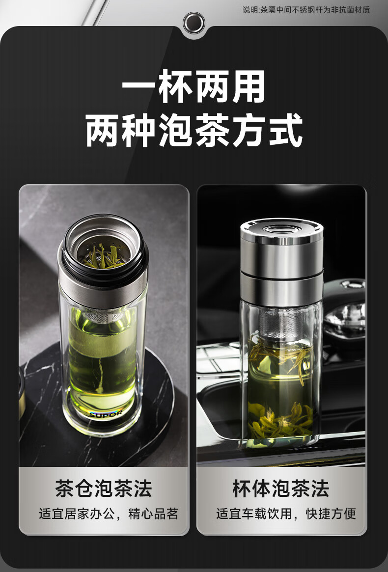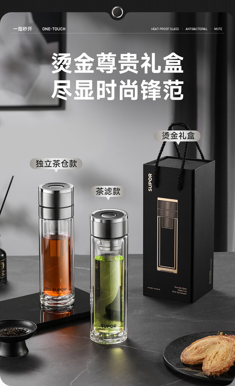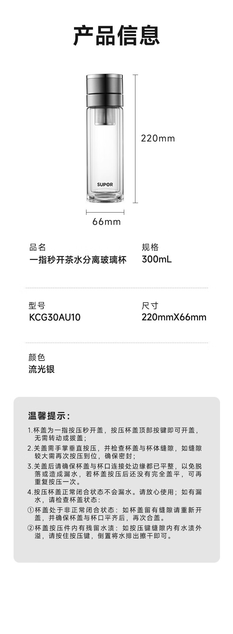 苏泊尔(SUPOR)300ml一键开盖茶水分离玻璃杯【独立茶仓款】KCG30AU10/个 流光银