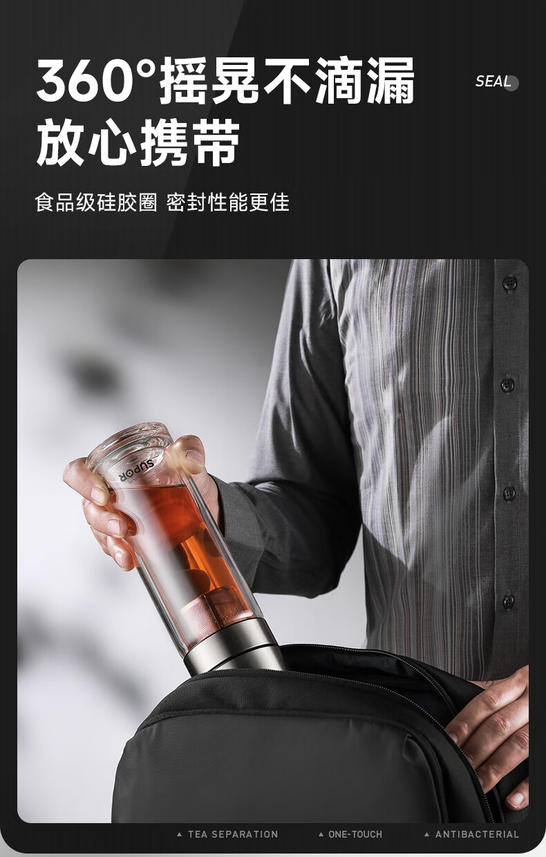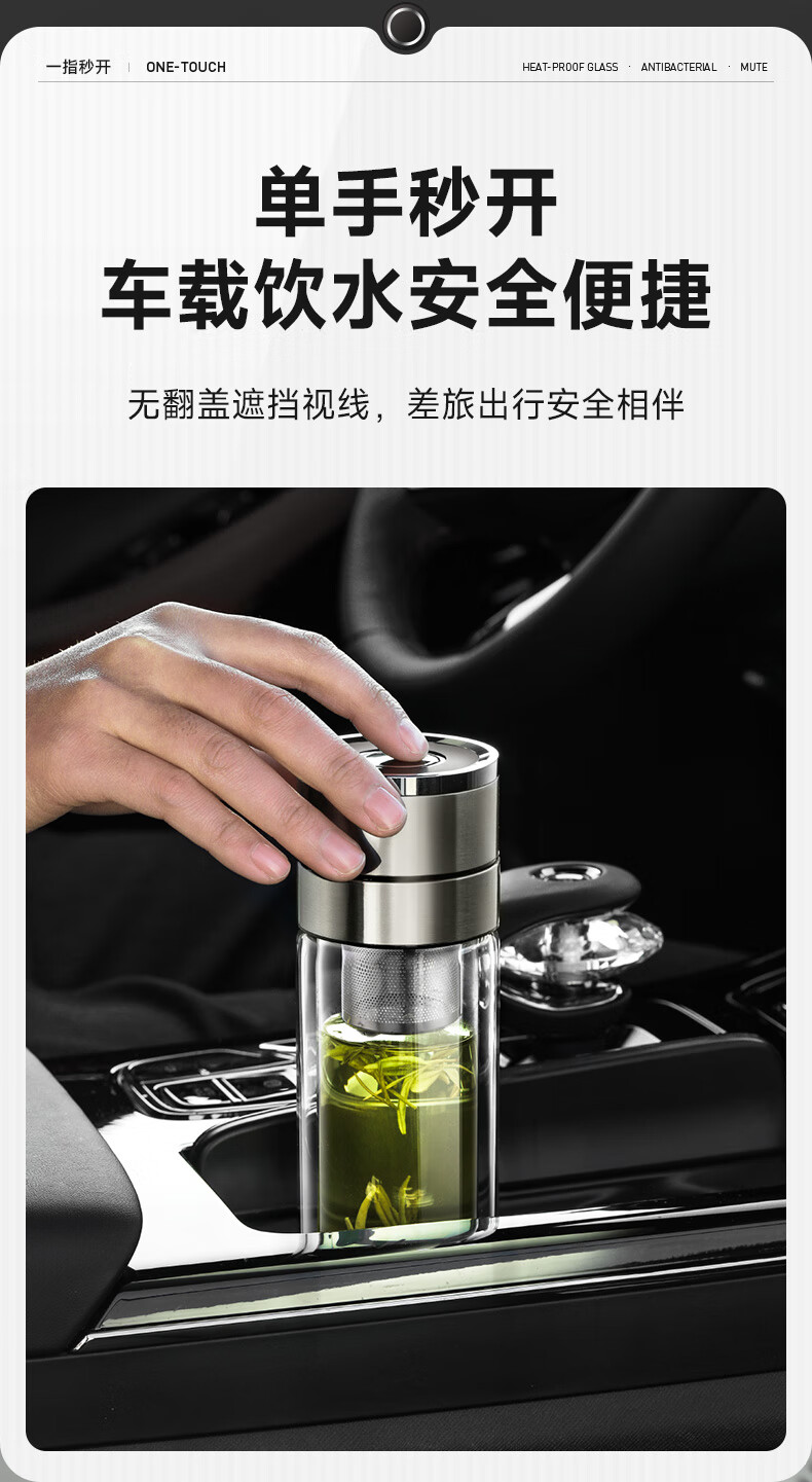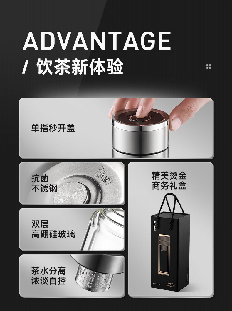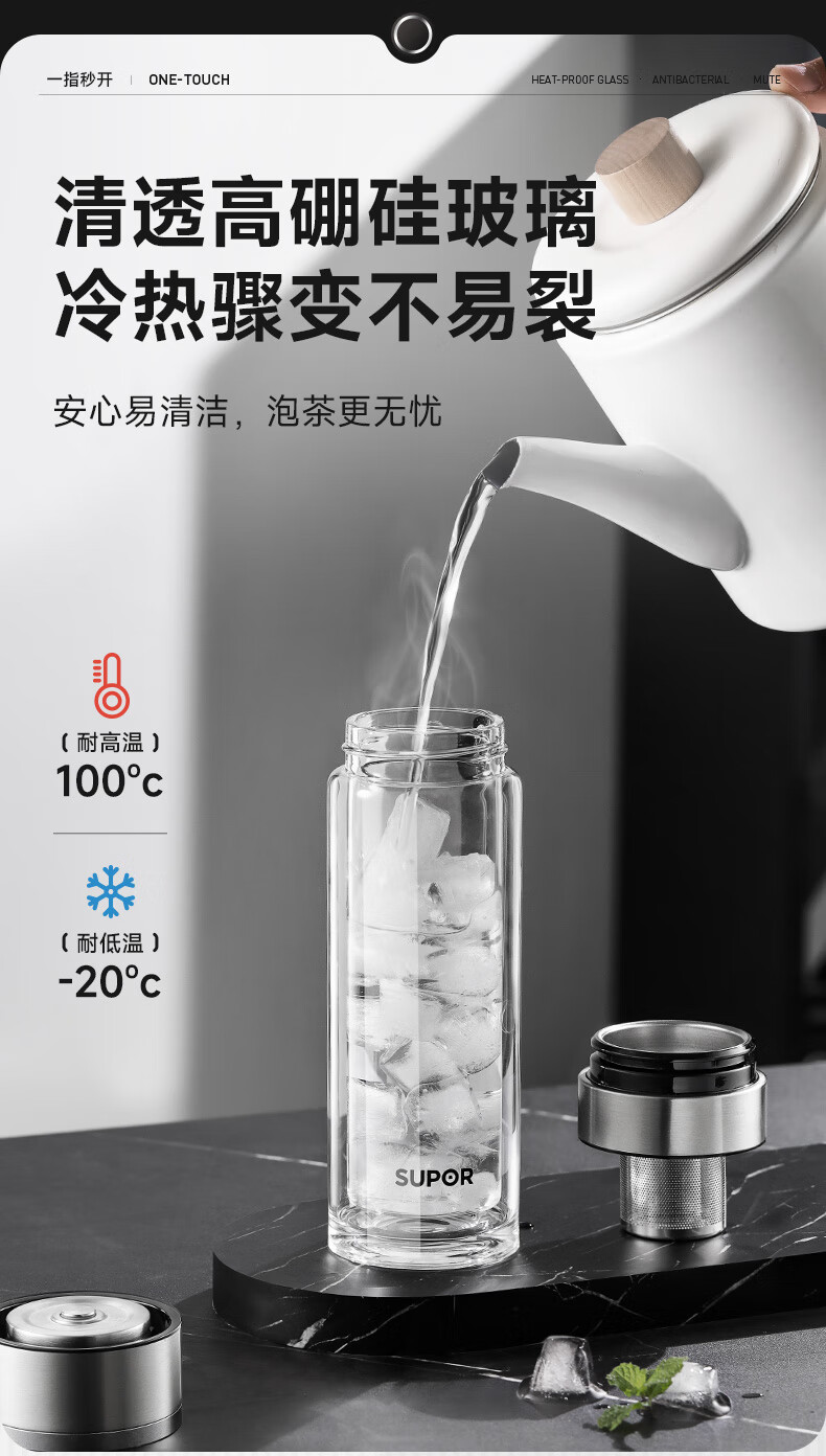 苏泊尔(SUPOR)300ml一键开盖茶水分离玻璃杯【独立茶仓款】KCG30AU10/个 流光银