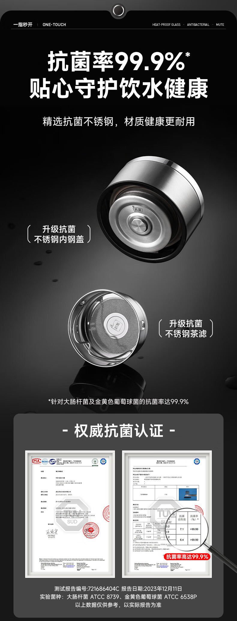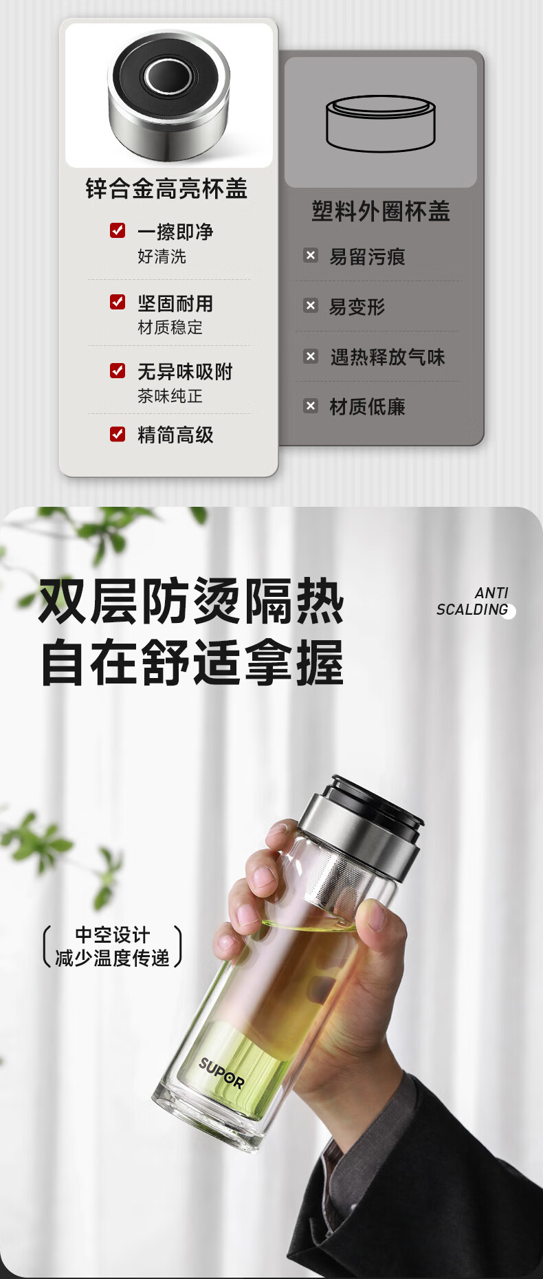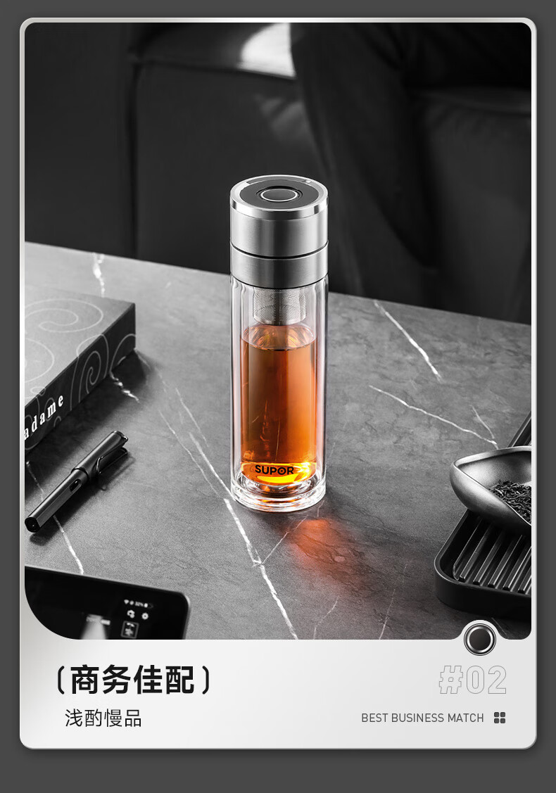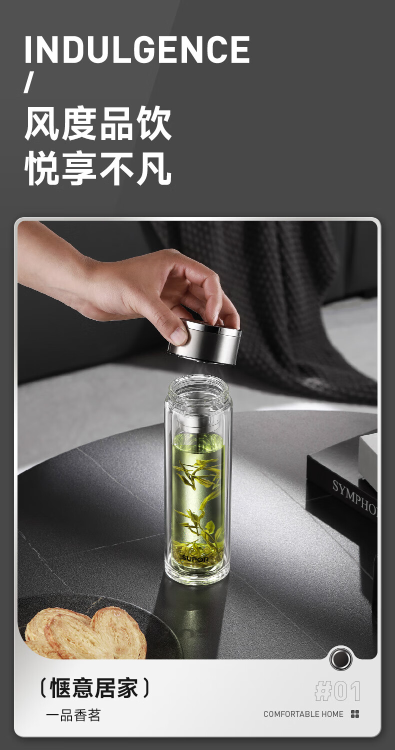 苏泊尔(SUPOR)300ml一键开盖茶水分离玻璃杯【独立茶仓款】KCG30AU10/个 流光银