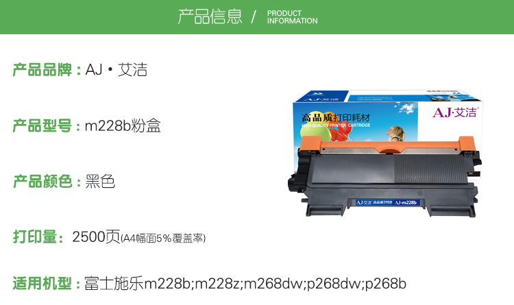 艾洁(AJ) m228b 打印量2500页 适用富士施乐m228b/m228z/m268dw/p268dw/p268b 粉盒 (计价单位:只) 黑色