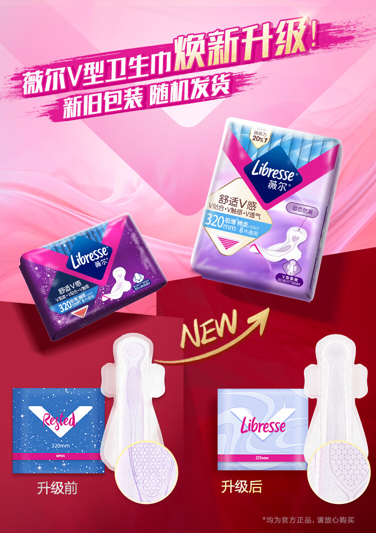 薇尔卫生巾姨妈巾 夜用卫生巾V感系列320mm 精准防漏8片装(单位:包) 佳人粉