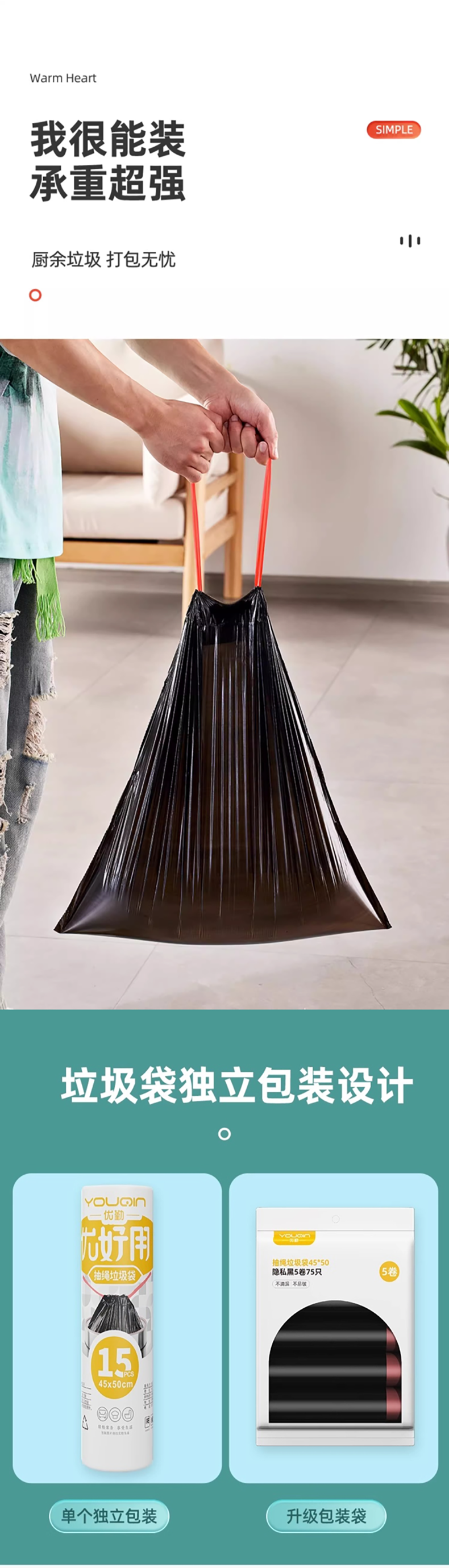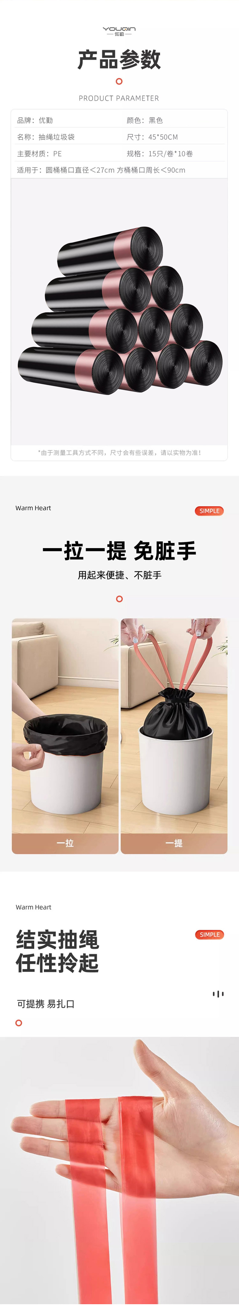 优勤(YOUQIN) JR-CSLJD45*50-YSH2J30Z#*10 大号升级加厚款【10卷150只】2.4丝/45*50cm 厨余抽绳式垃圾袋 黑色(单位:套)