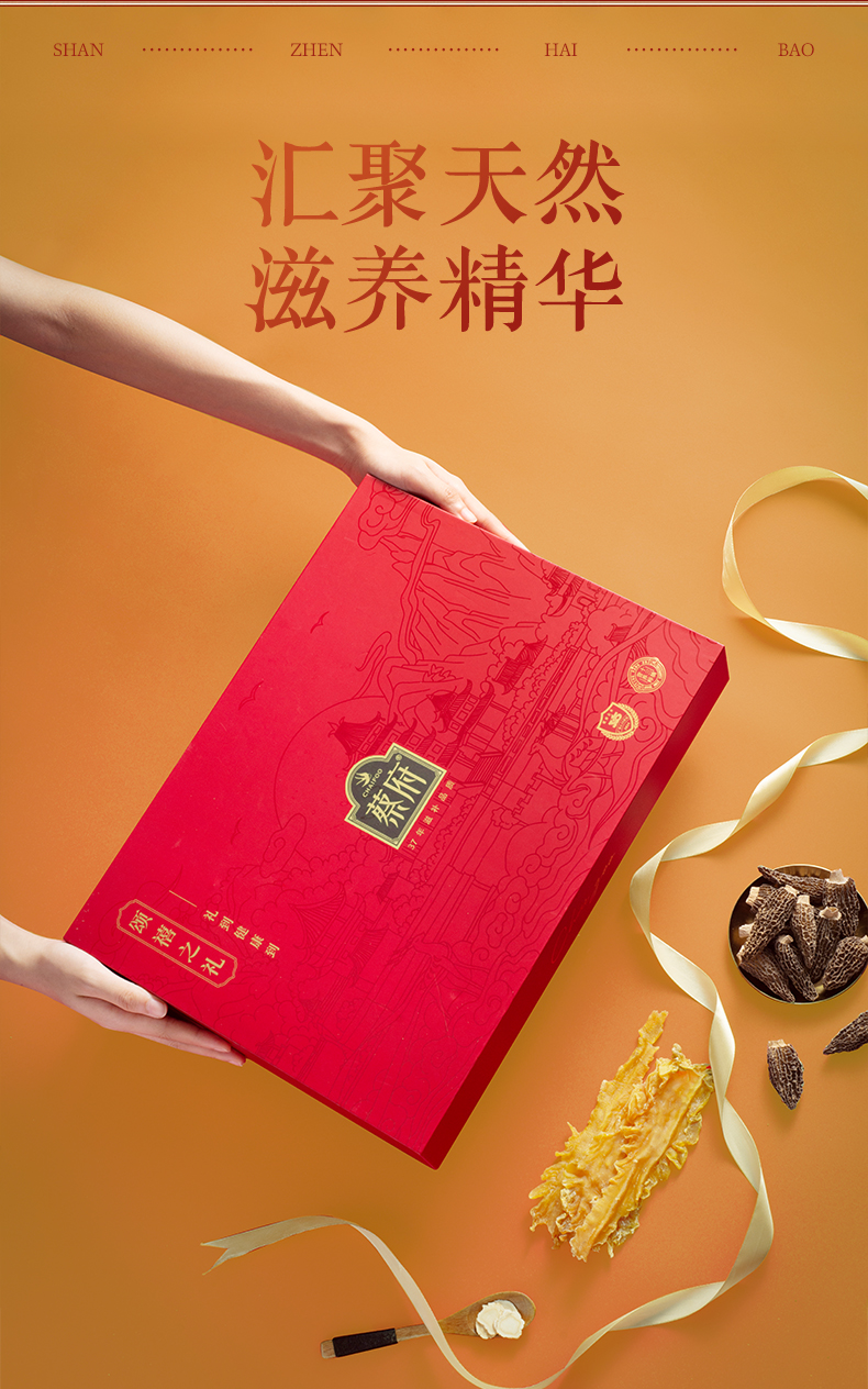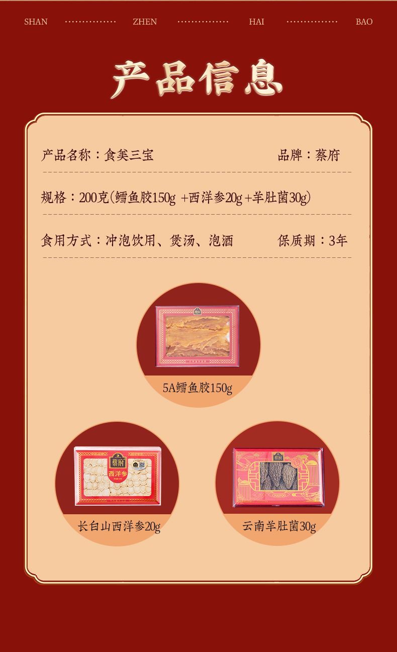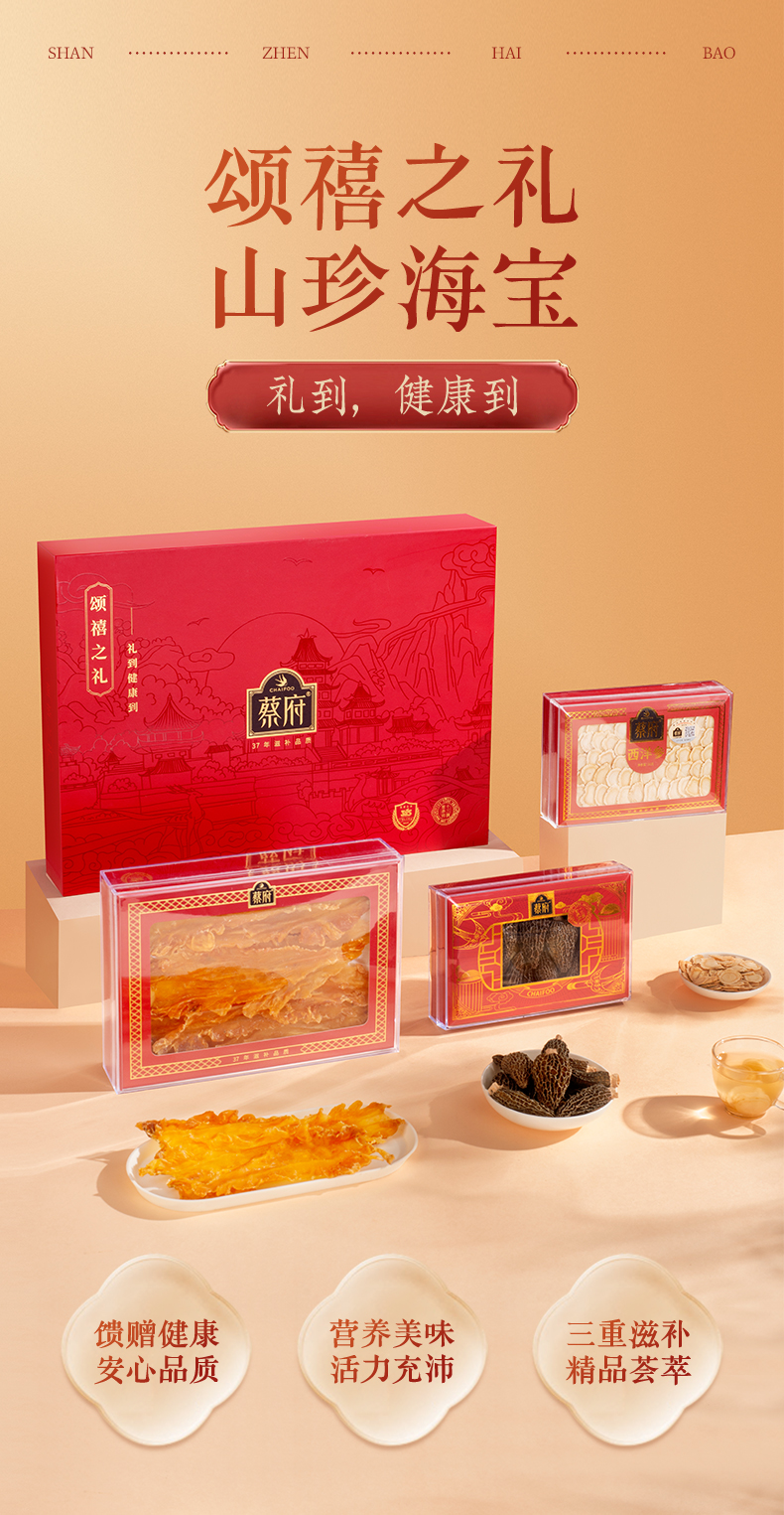 蔡府(CHAIFOO) 滋补干货礼盒鳕鱼胶西洋参羊肚菌 食美三宝礼盒 200g 红色(单位:盒)