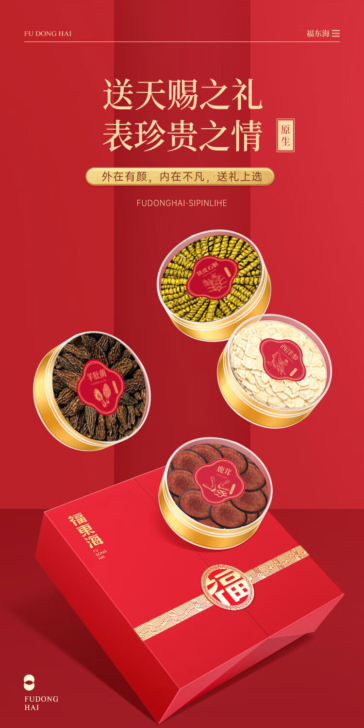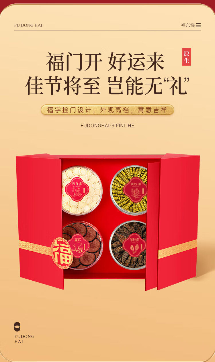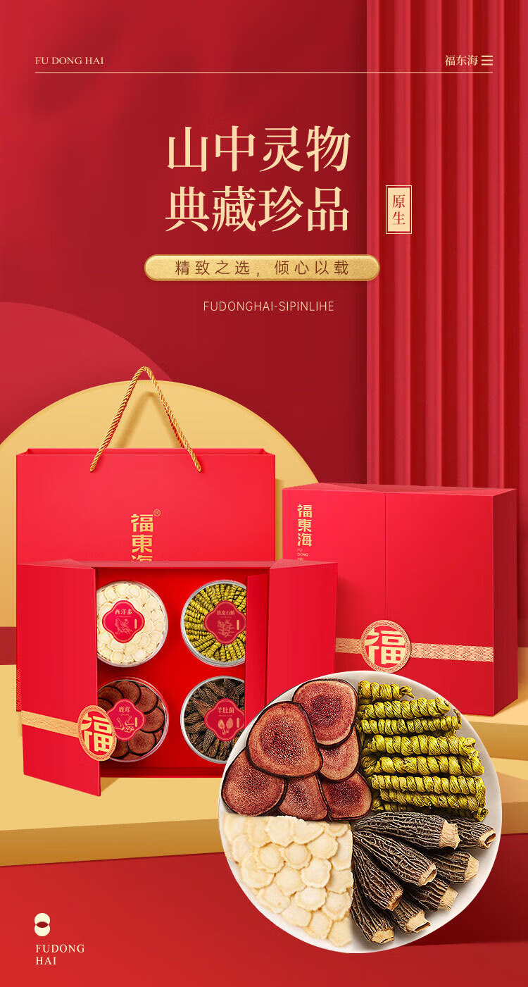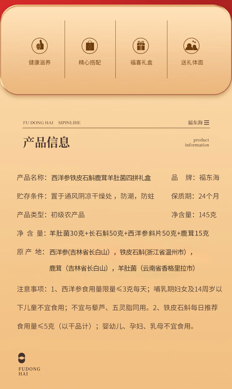 福东海(fudonghai) 羊肚菌 长石斛 西洋参斜片 鹿茸 四拼礼盒 145g 红色(单位:盒)
