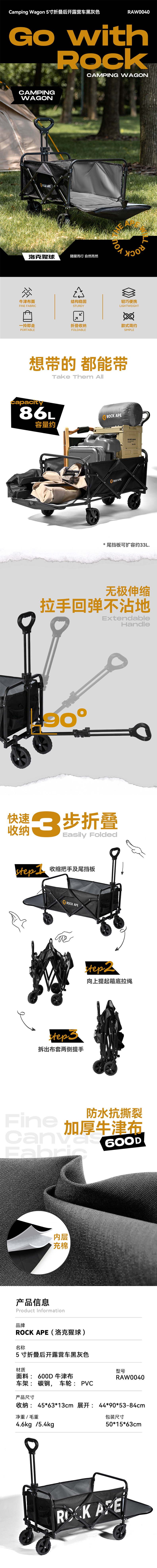 洛克猩球(Rock Ape) 5寸折叠后开露营车黑色RAW0040 RAW0040 4600g/44*90*53-84/86L 黑灰色(单位:个)