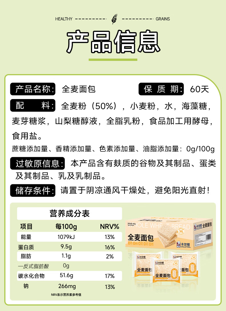 卡尔顿(Calleton) 全麦面包 早餐代餐 480g 黄色(单位:箱)