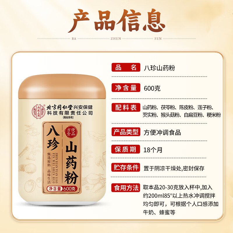同仁堂(TRT) 内廷上用八珍山药粉 甄选古方地道八珍 600g 黄色(单位:盒)