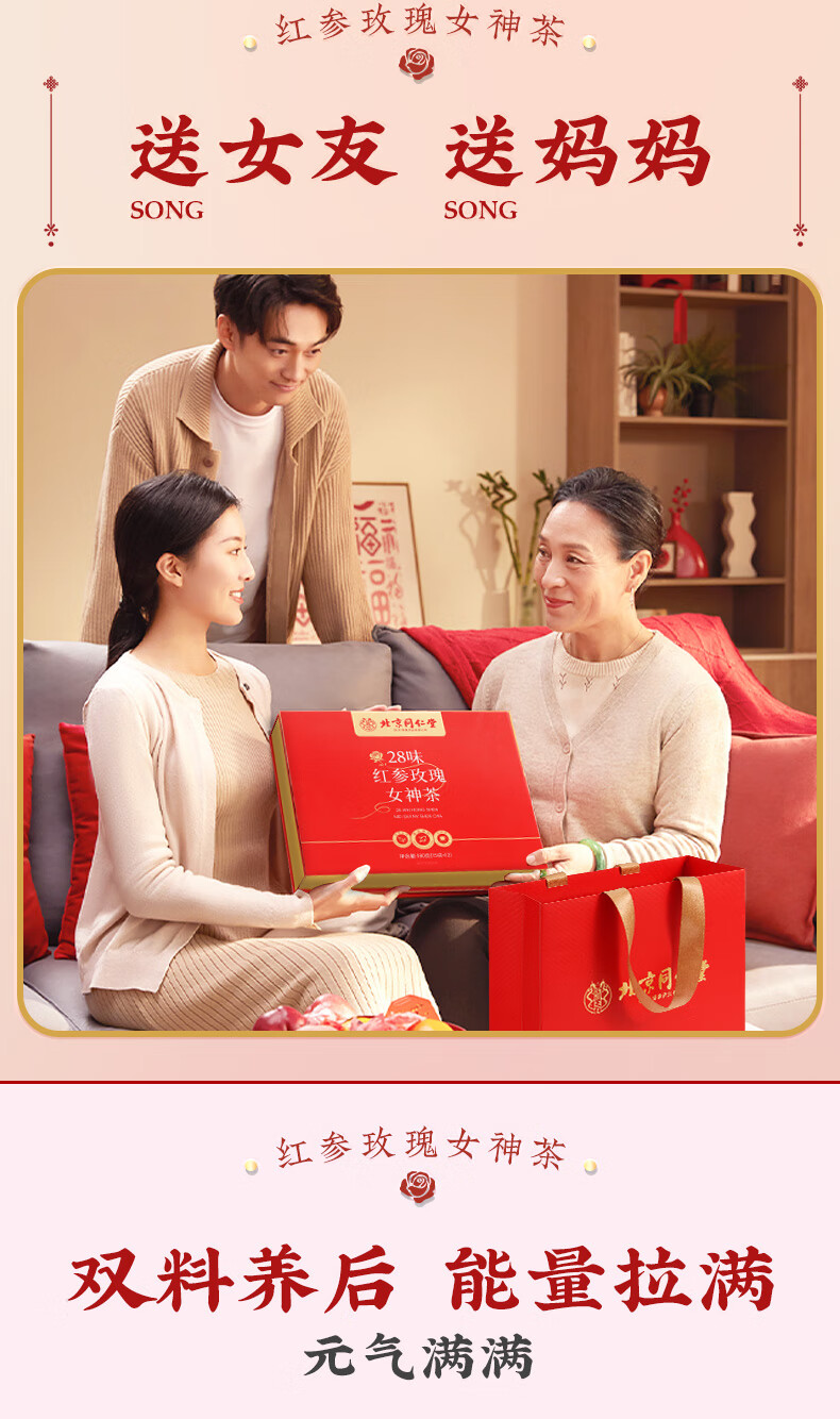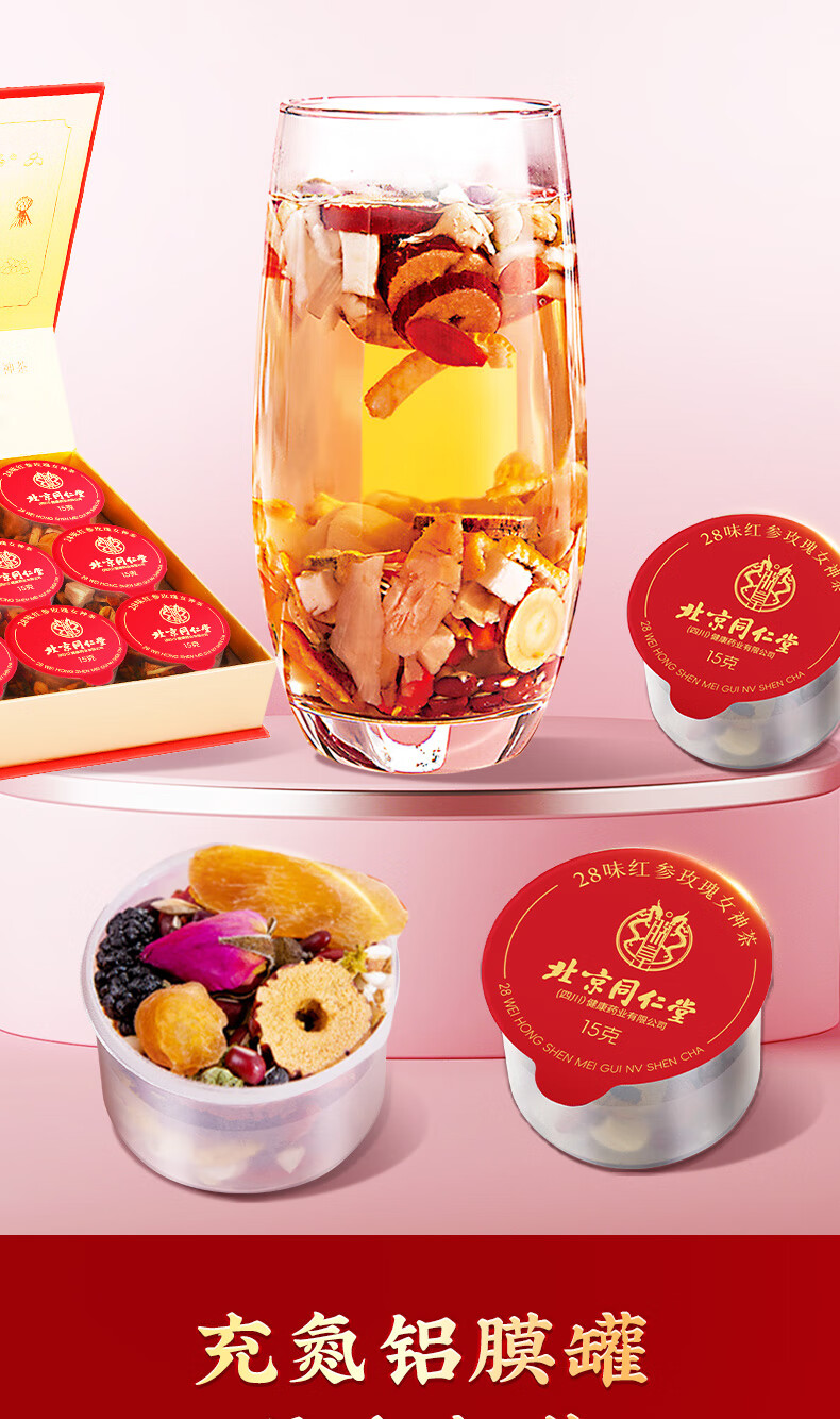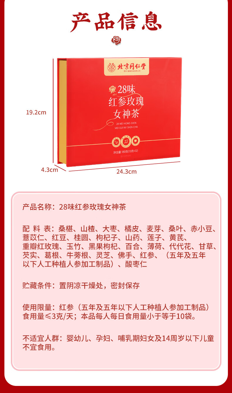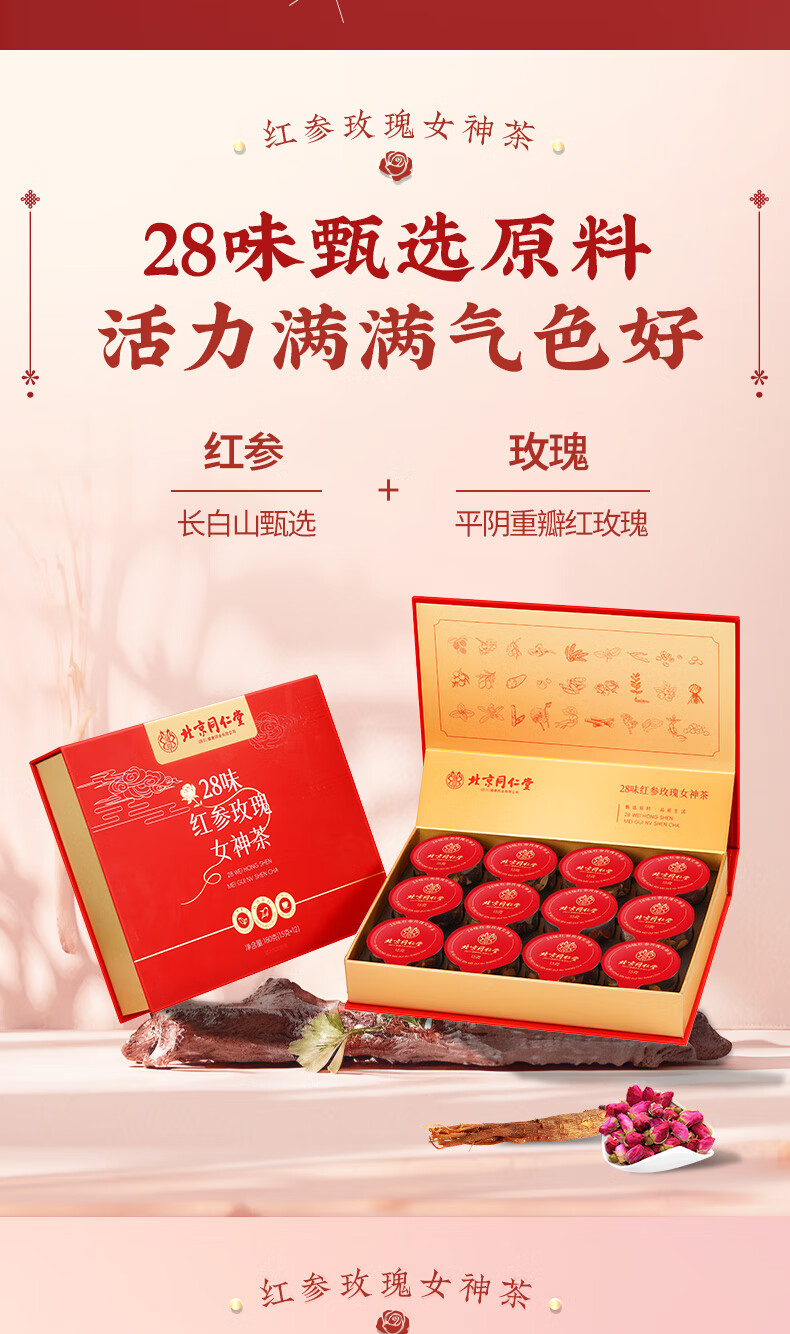 同仁堂(TRT) 朕皇28味红参玫瑰女神茶 小罐茶 180g(15g*12罐) 红色(单位:盒)