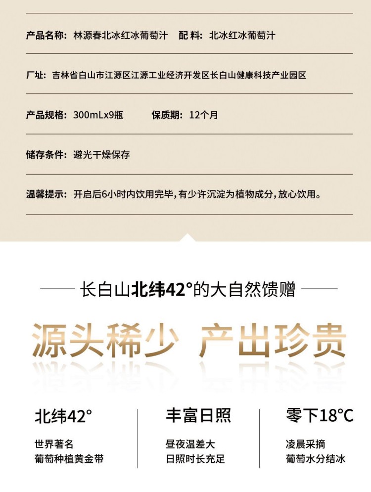 林源春 北冰红葡萄汁 100%NFC 300ml*9 紫色(单位:箱)