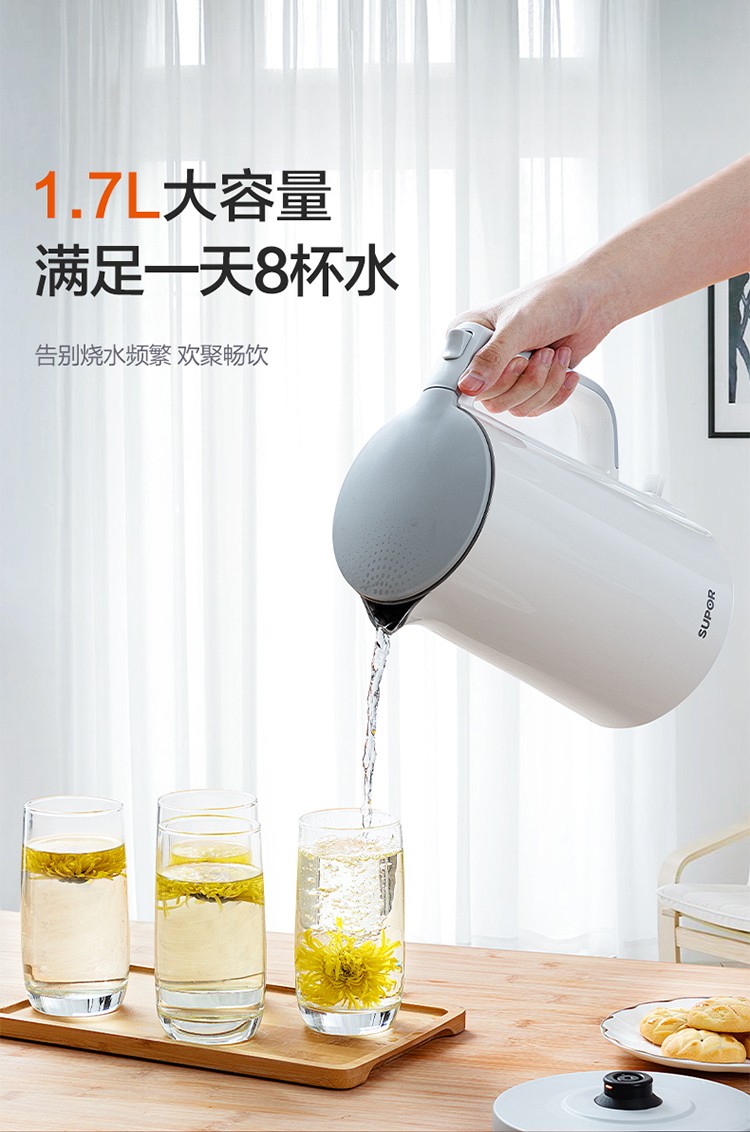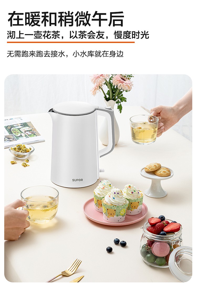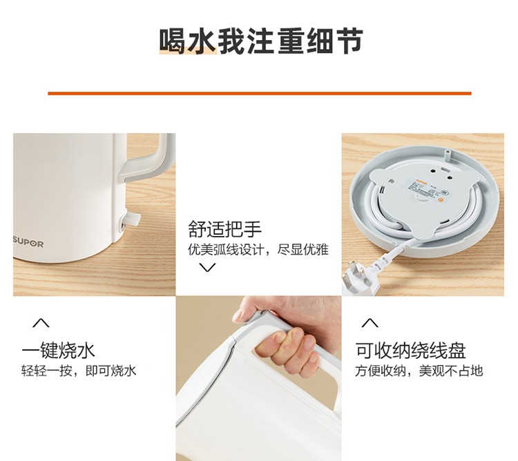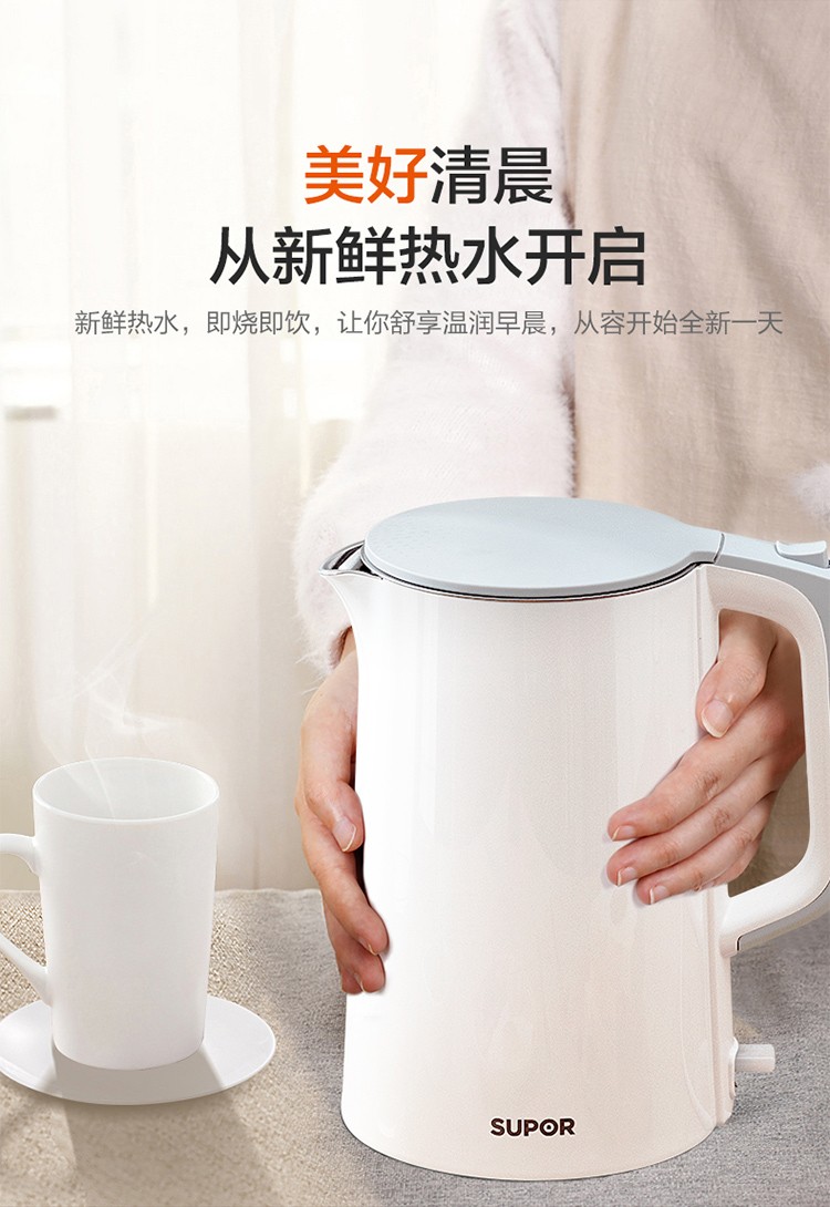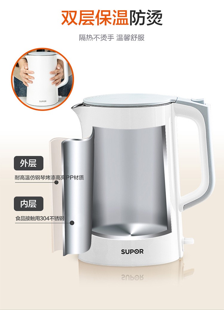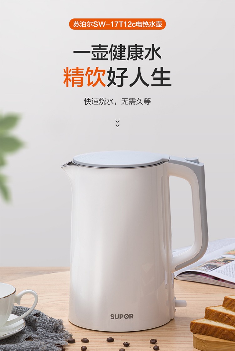 苏泊尔(SUPOR)电水壶1.7升烧水壶 304不锈钢一体无缝内胆双层保温防烫SW-17T12C 台 白色