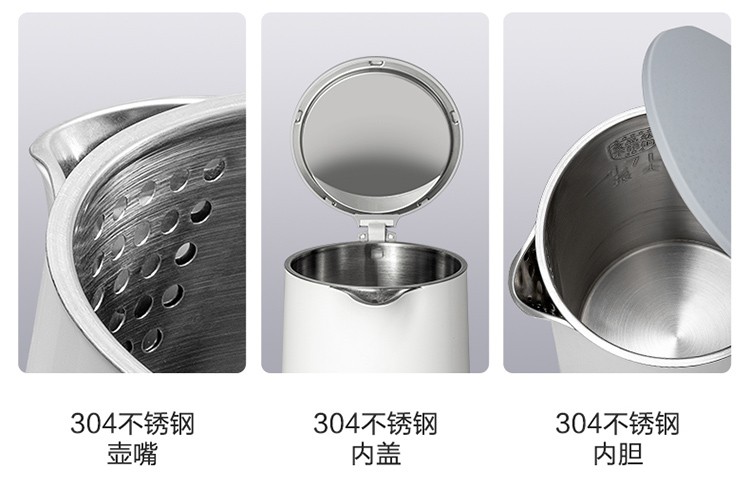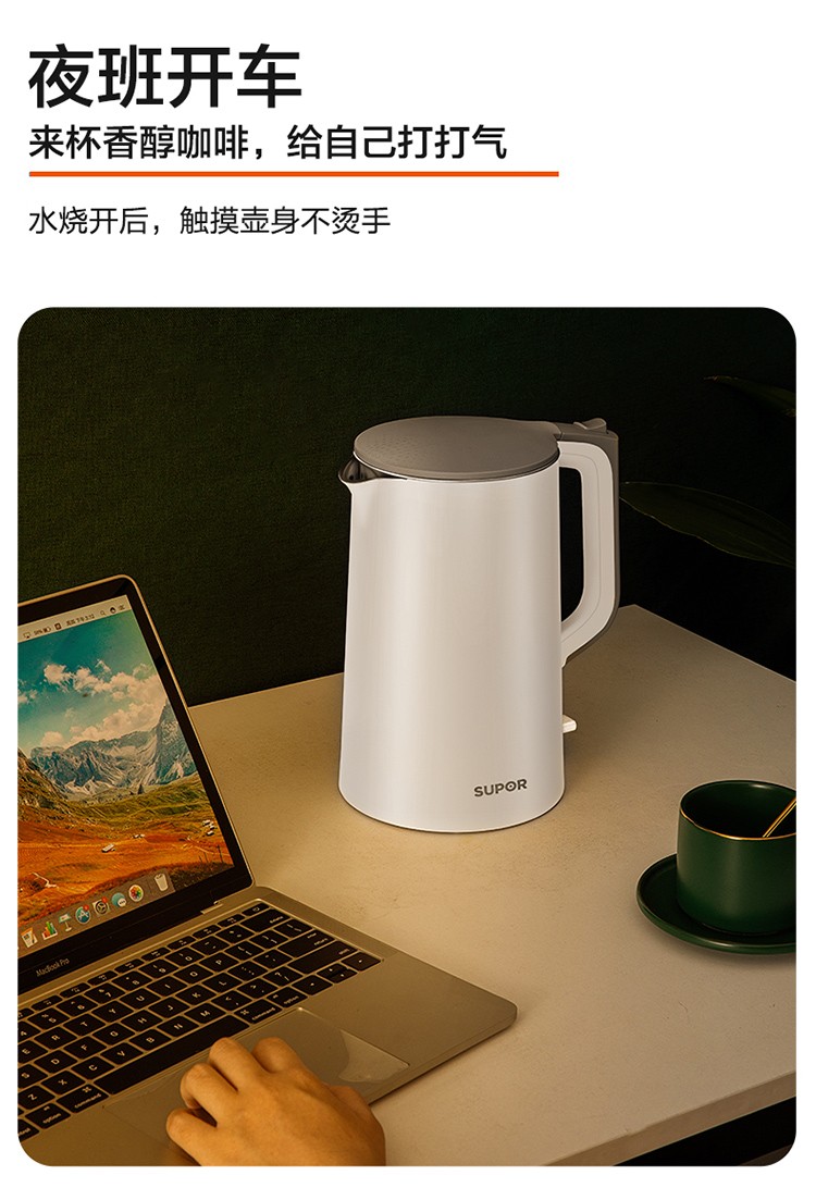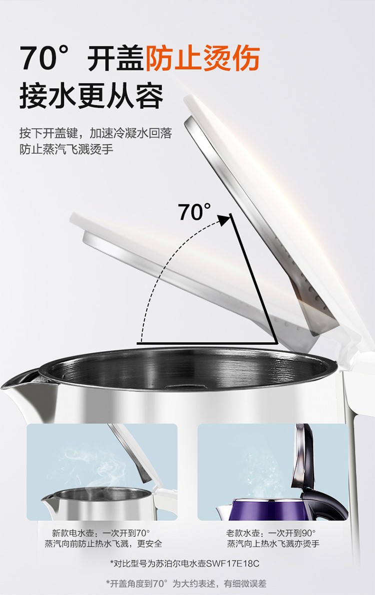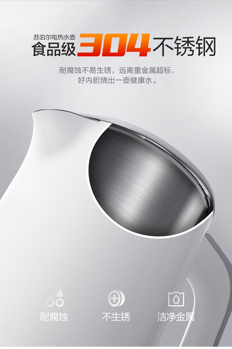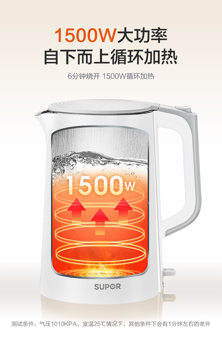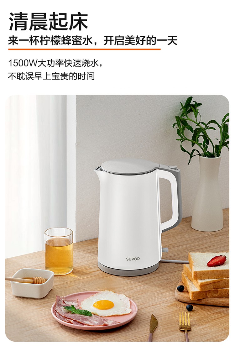 苏泊尔(SUPOR)电水壶1.7升烧水壶 304不锈钢一体无缝内胆双层保温防烫SW-17T12C 台 白色
