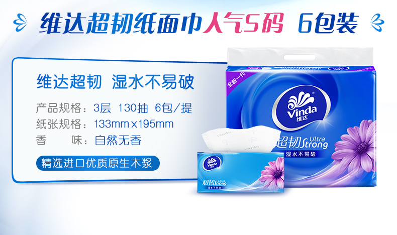 维达(Vinda) 超韧抽纸3层130抽6包S码纸巾家用提装V2239-06E(单位:提) 白色