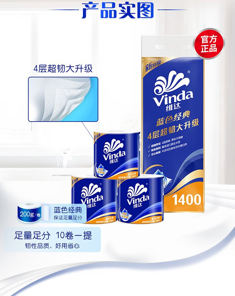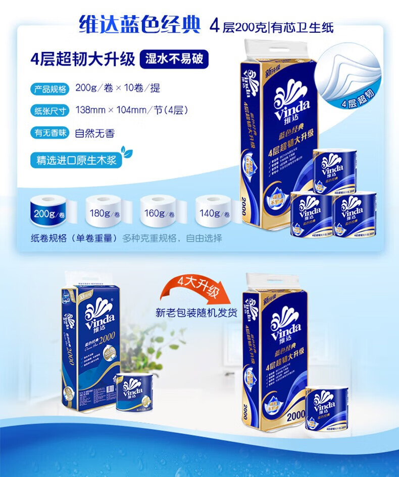 维达(Vinda) 卷纸 蓝色经典4层200克*10卷 V4073-10E(单位:提) 白色