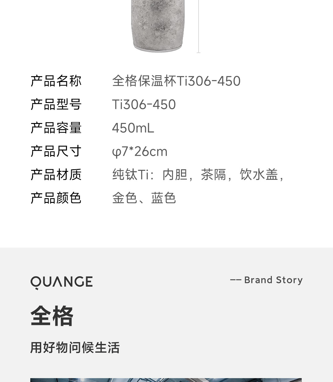 全格(Quange) Ti306-450 450ml 纯钛保温杯 蓝色(单位:个)