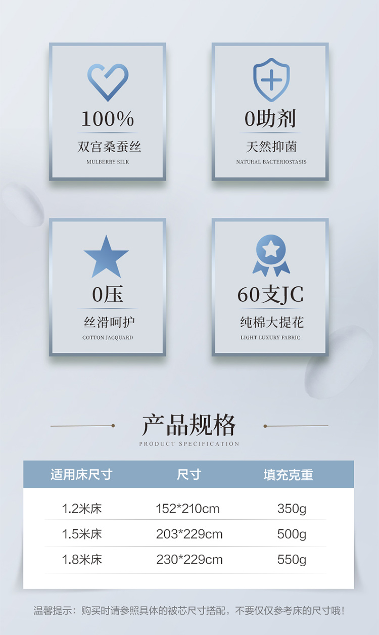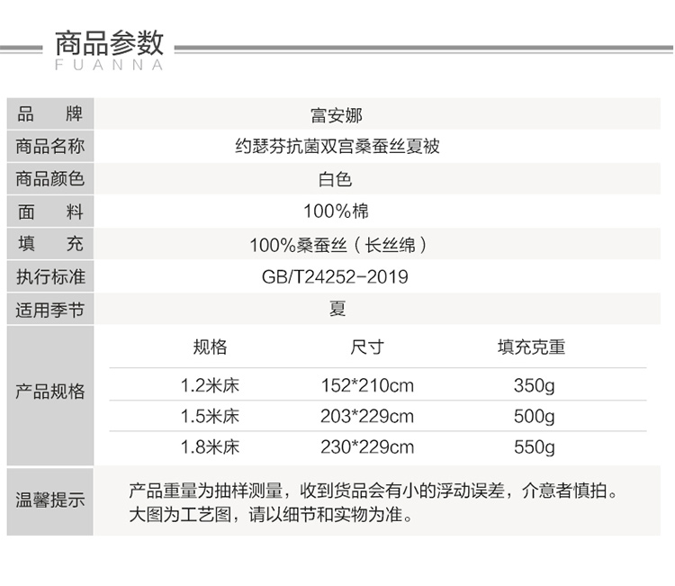 富安娜 60支长绒棉抗菌双宫桑蚕丝夏被 约瑟芬 8120017782095 203*229cm 白色(单位:床)