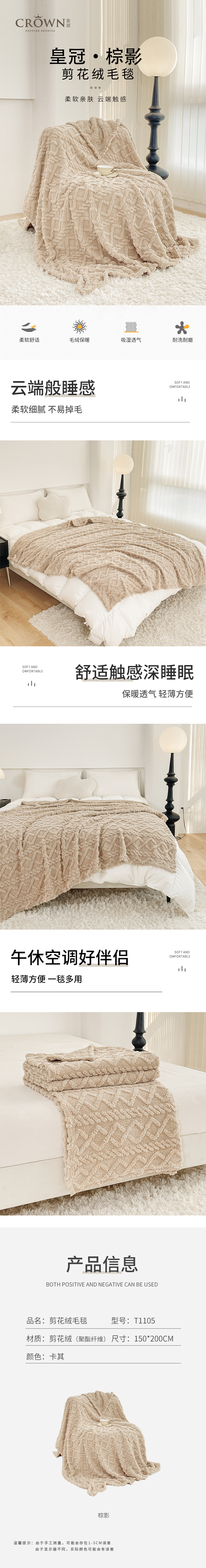 皇冠(CROWN) 剪花绒毛毯 T1105 150*200CM 粽色(单位:条)