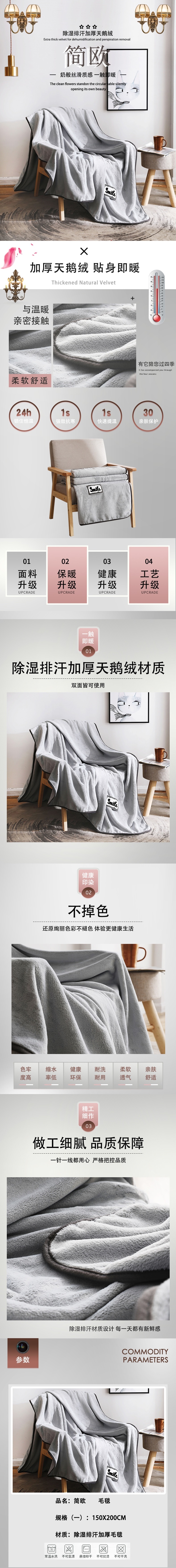 金丝莉天鹅绒简欧除湿毛毯150×200cm JT-1107 (条) 灰色