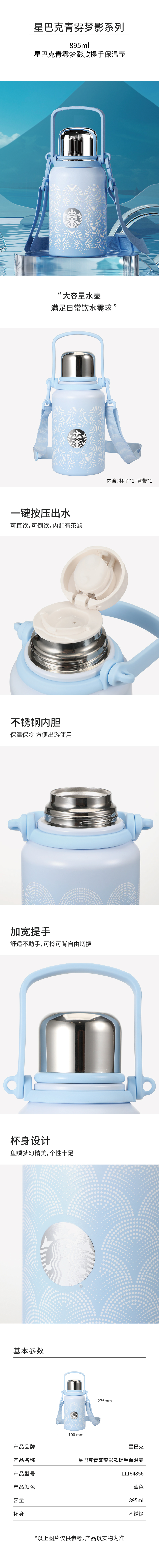 星巴克(Starbucks) 提手保温壶 11164856 895ml 青雾梦影蓝色(单位:个)