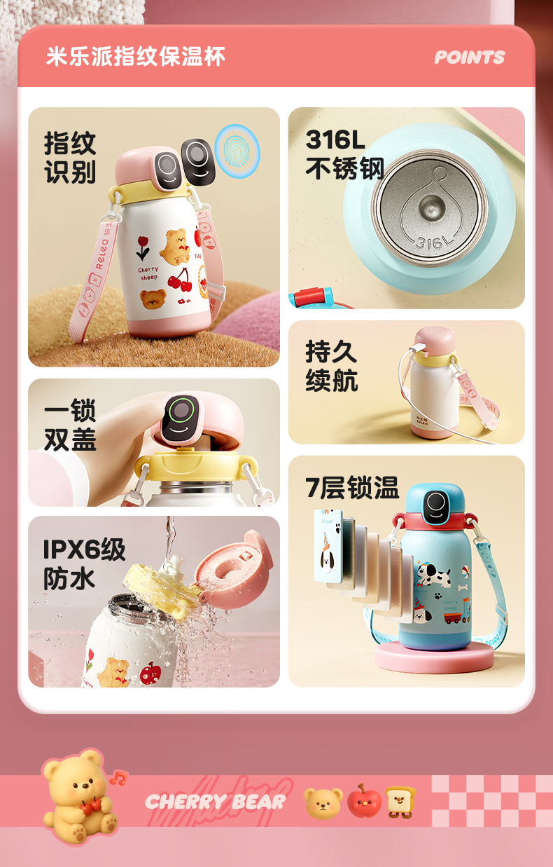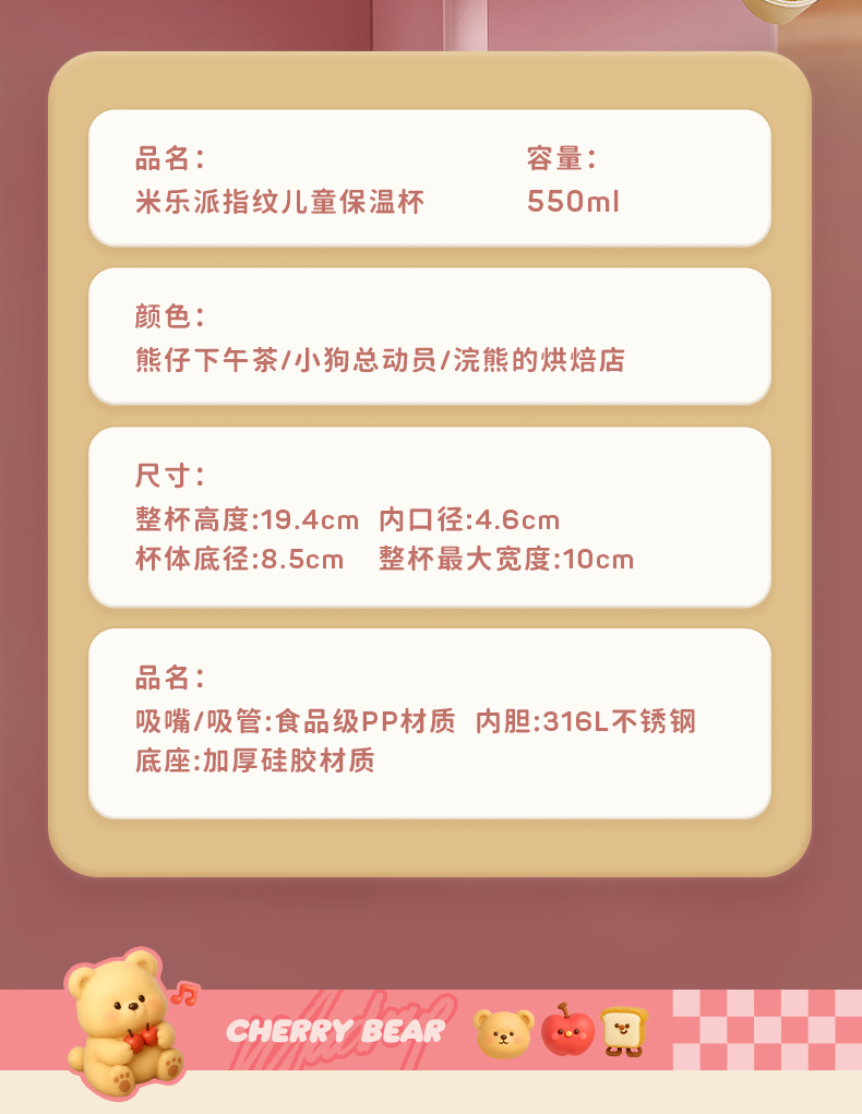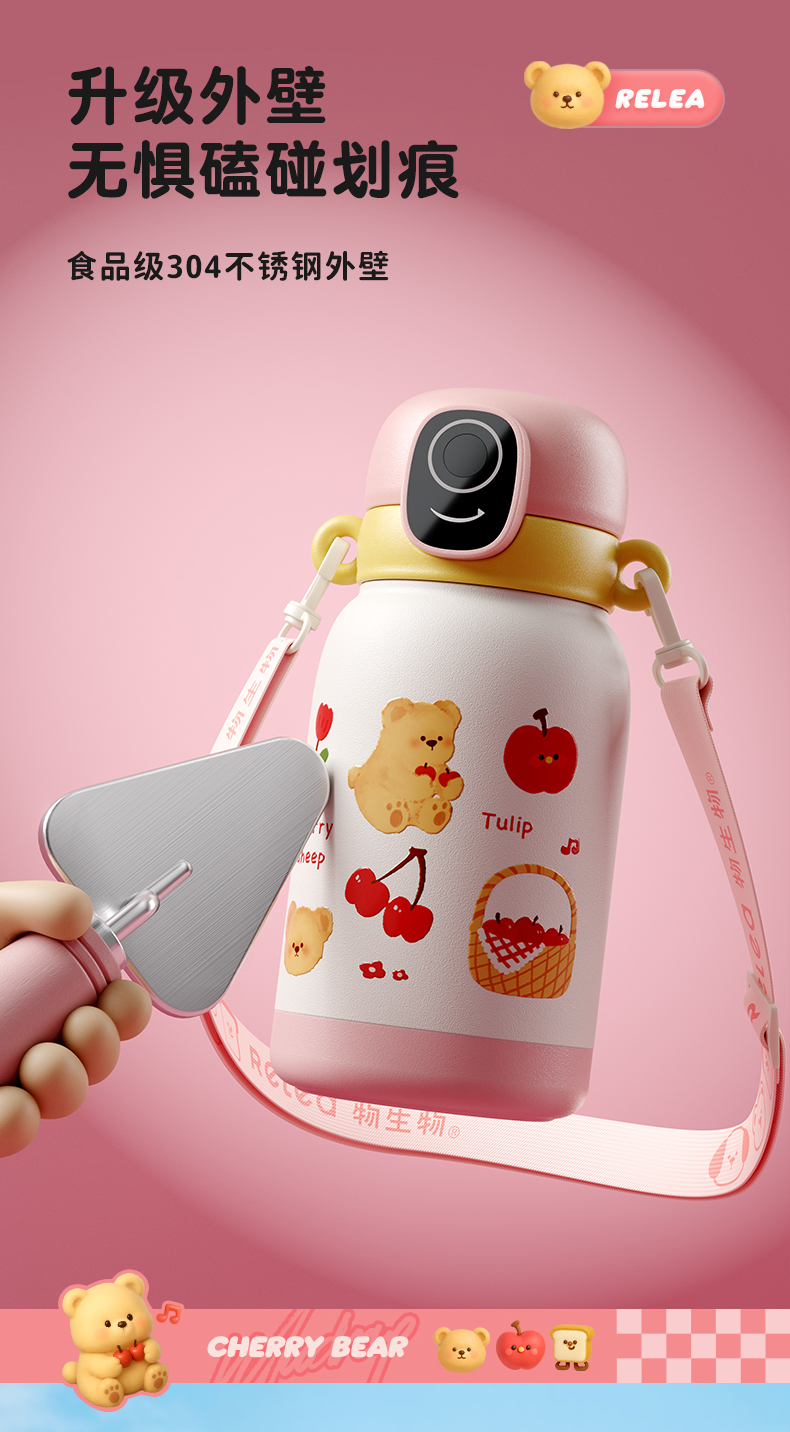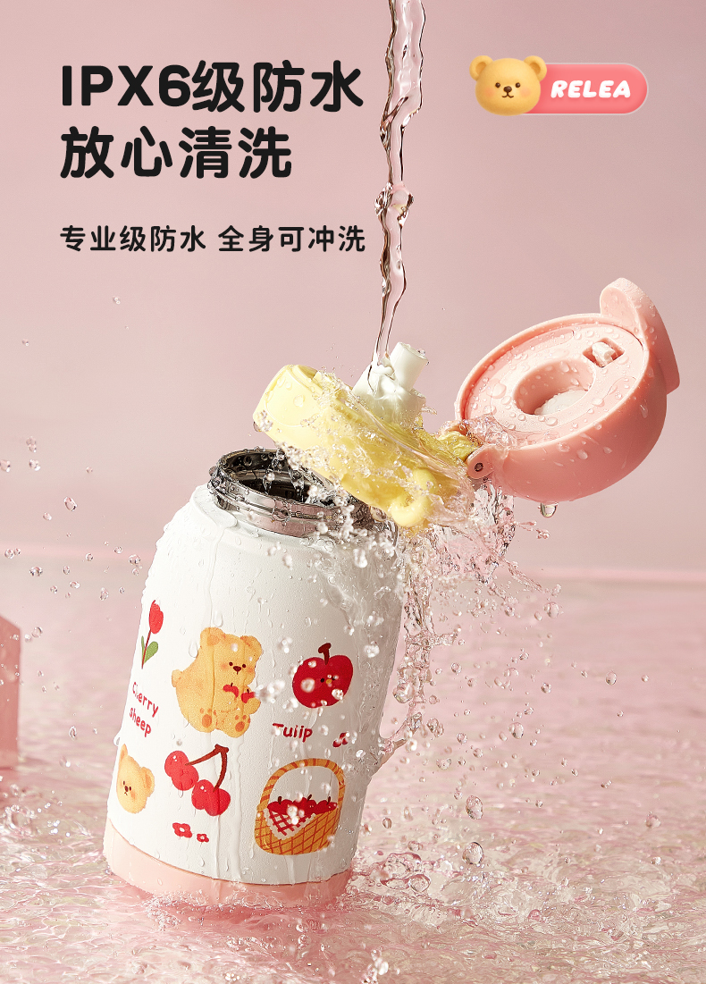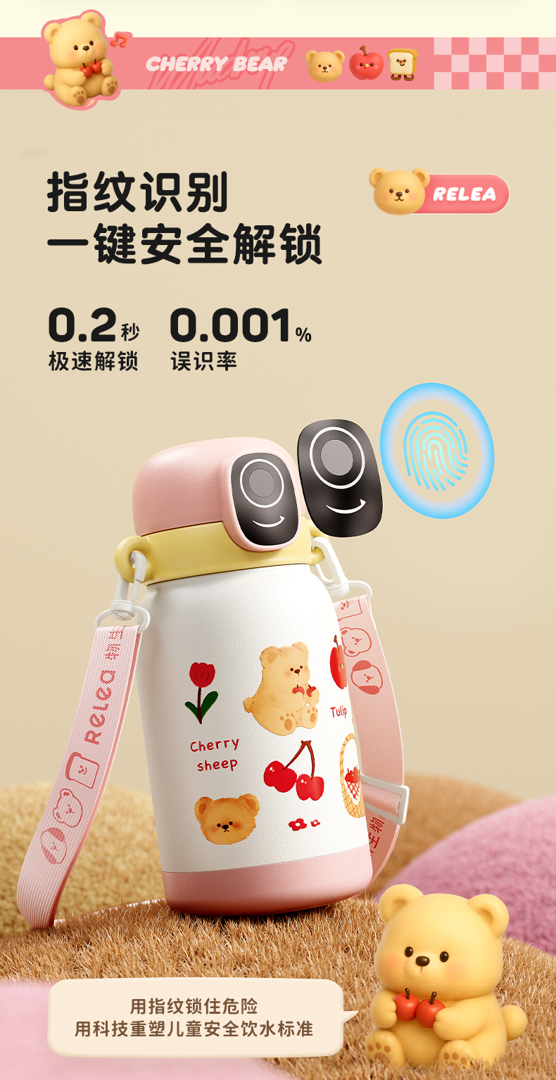 物生物(RELEA) 米乐派指纹儿童保温杯 JV012525-0550-FQ00 550ML 熊仔下午茶(粉)(单位:个)