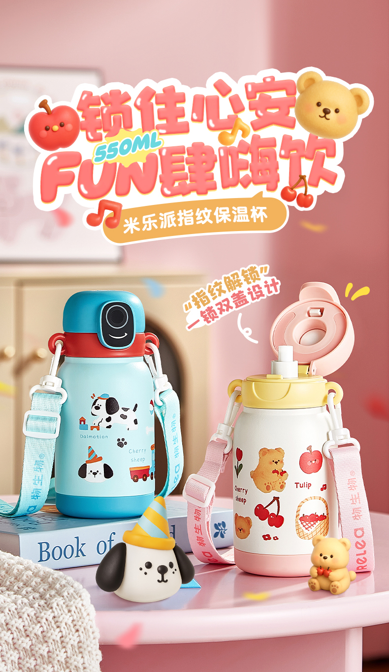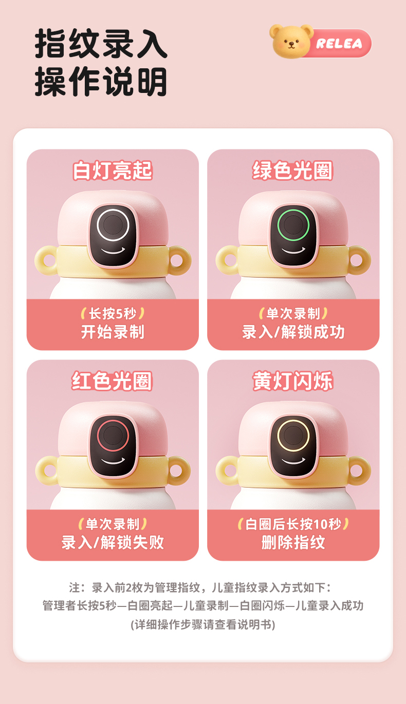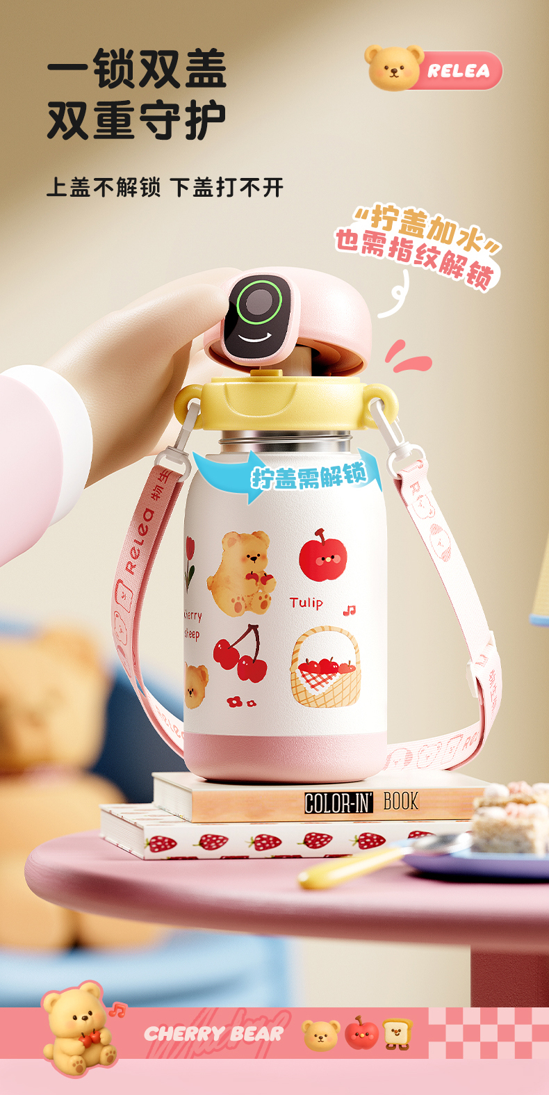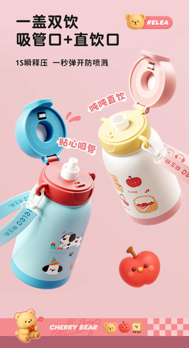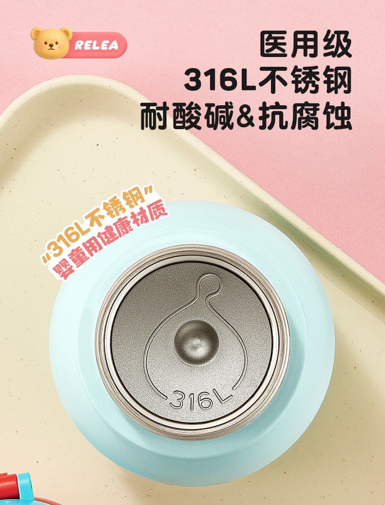 物生物(RELEA) 米乐派指纹儿童保温杯 JV012525-0550-FQ00 550ML 熊仔下午茶(粉)(单位:个)