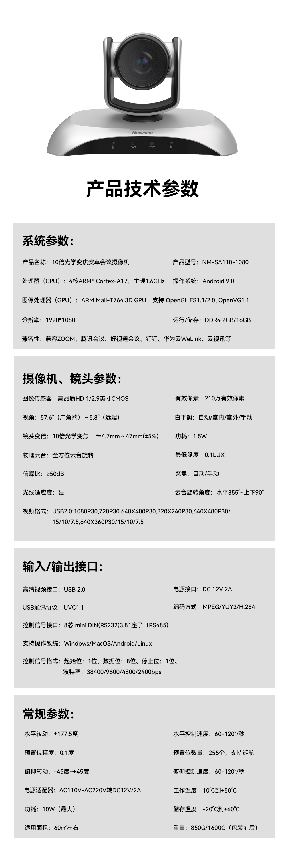 纽曼(Newmine) 摄像头 NM-SA110-1080 10倍光学变焦 银色(单位:台)