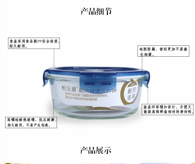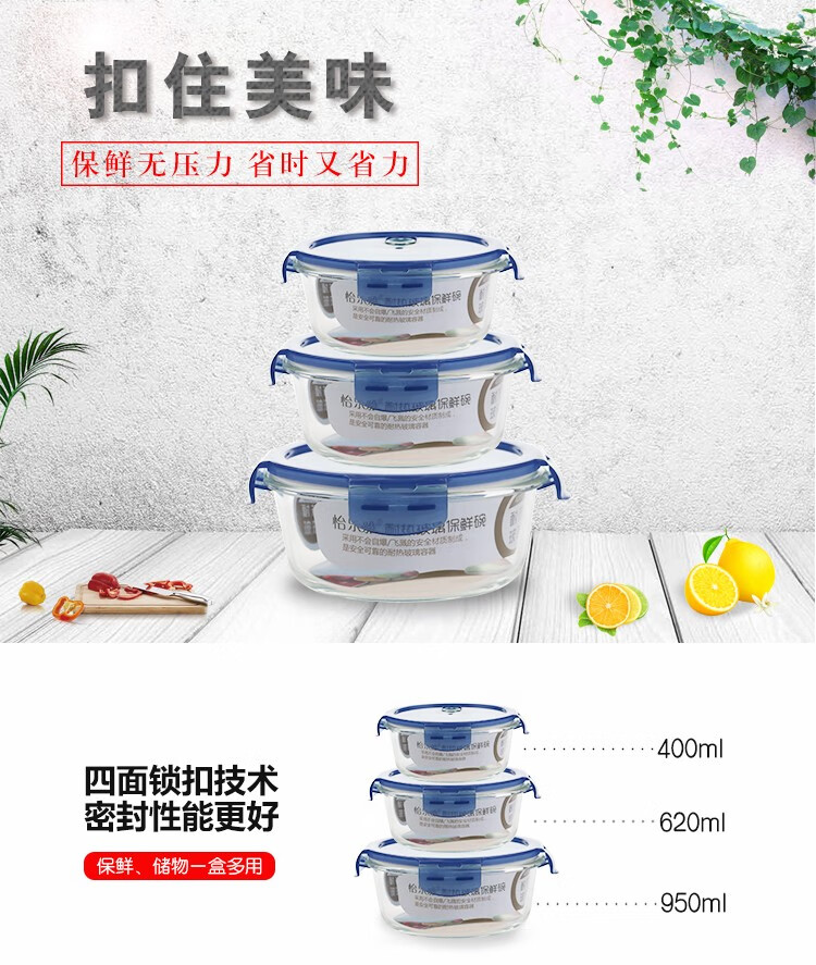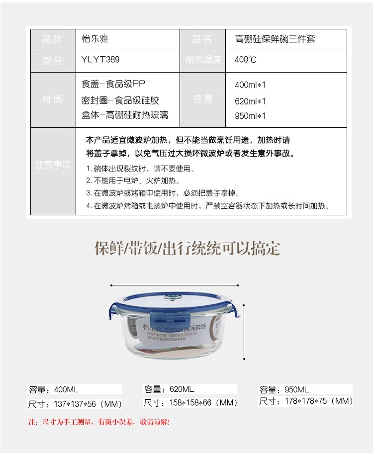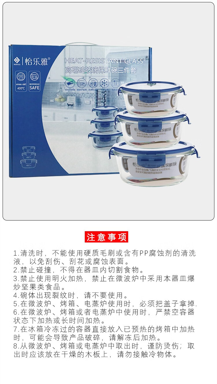 怡乐雅 高硼硅保鲜碗三件套 YLYT389 400ml *1+620ML*1+950ml*1 蓝色(单位:套)