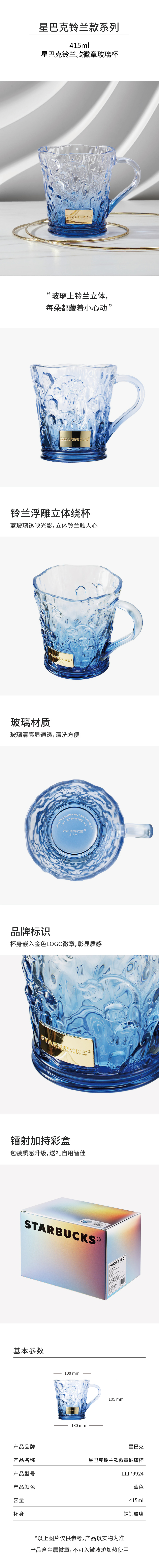 星巴克(Starbucks) 铃兰款徽章玻璃杯 11179924 415ml 蓝色(单位:个)