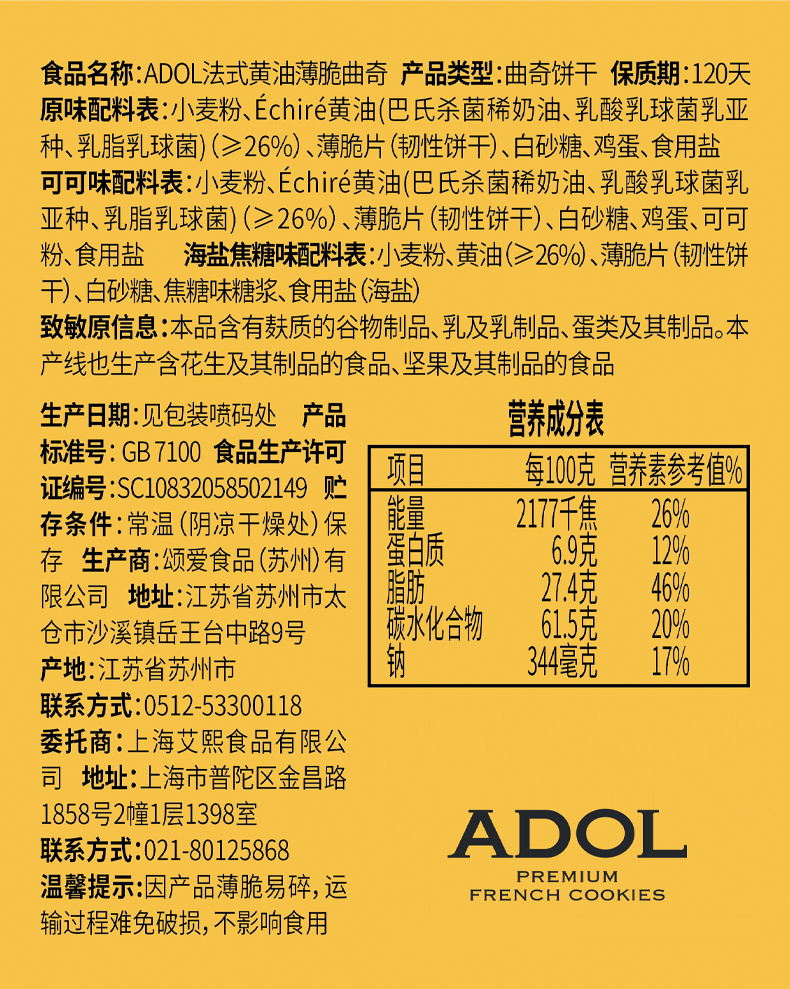 ADOL 薄脆曲奇 饼干 108g 鹅仔黄(单位:盒)