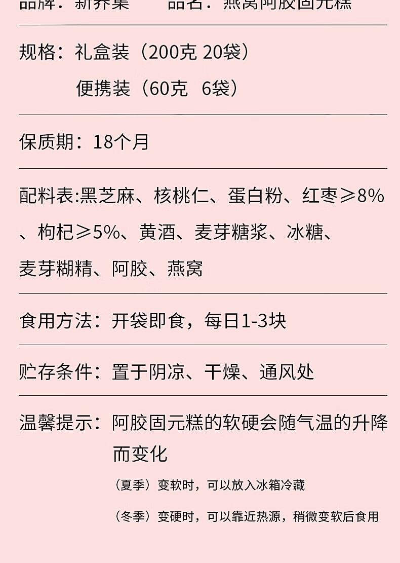 新养集 燕窝阿胶糕 软糯香甜 10g*20袋 粉色(单位:盒)