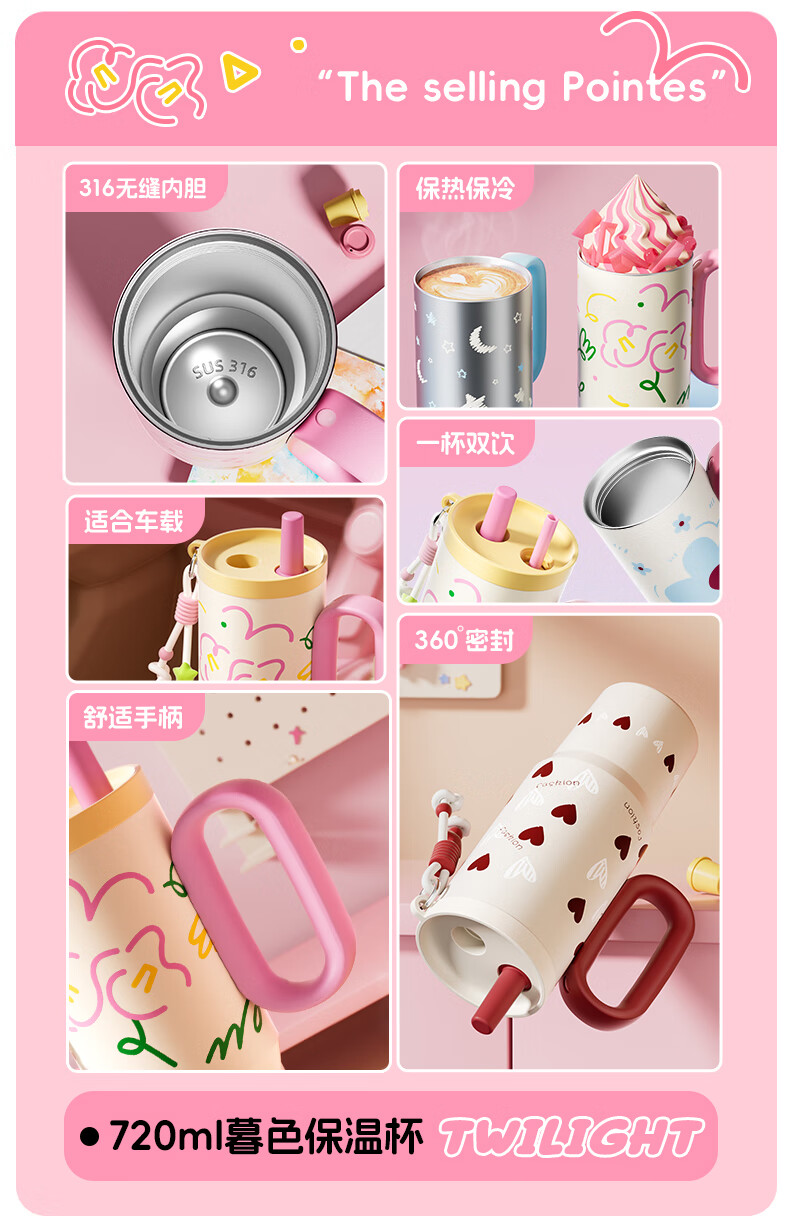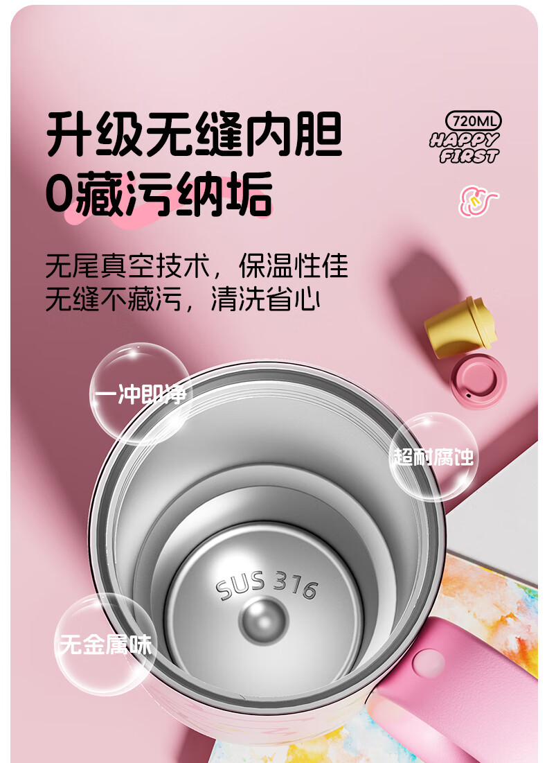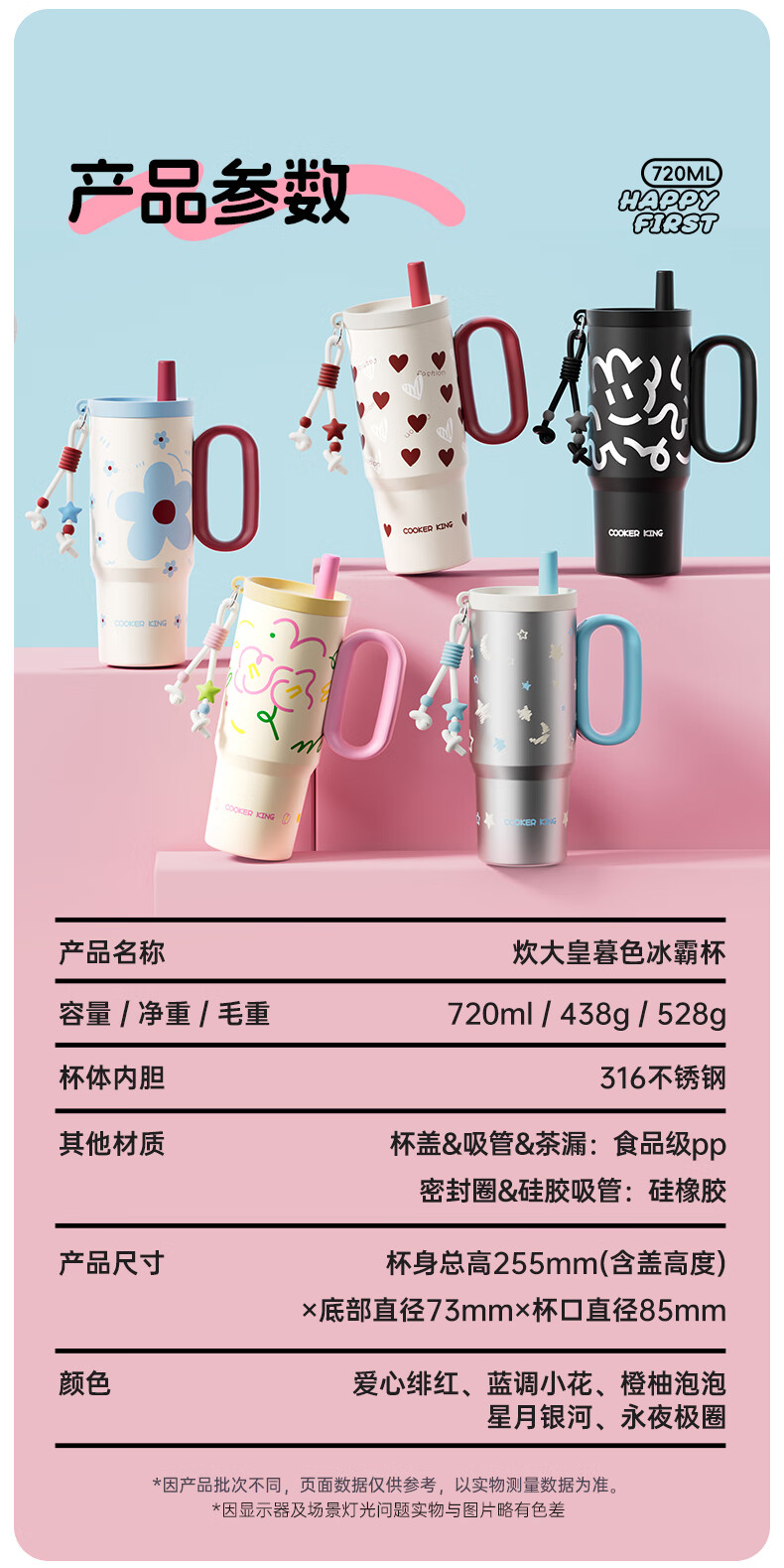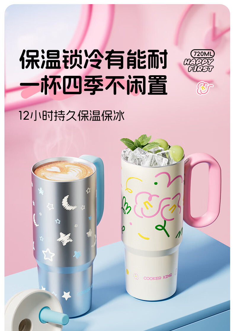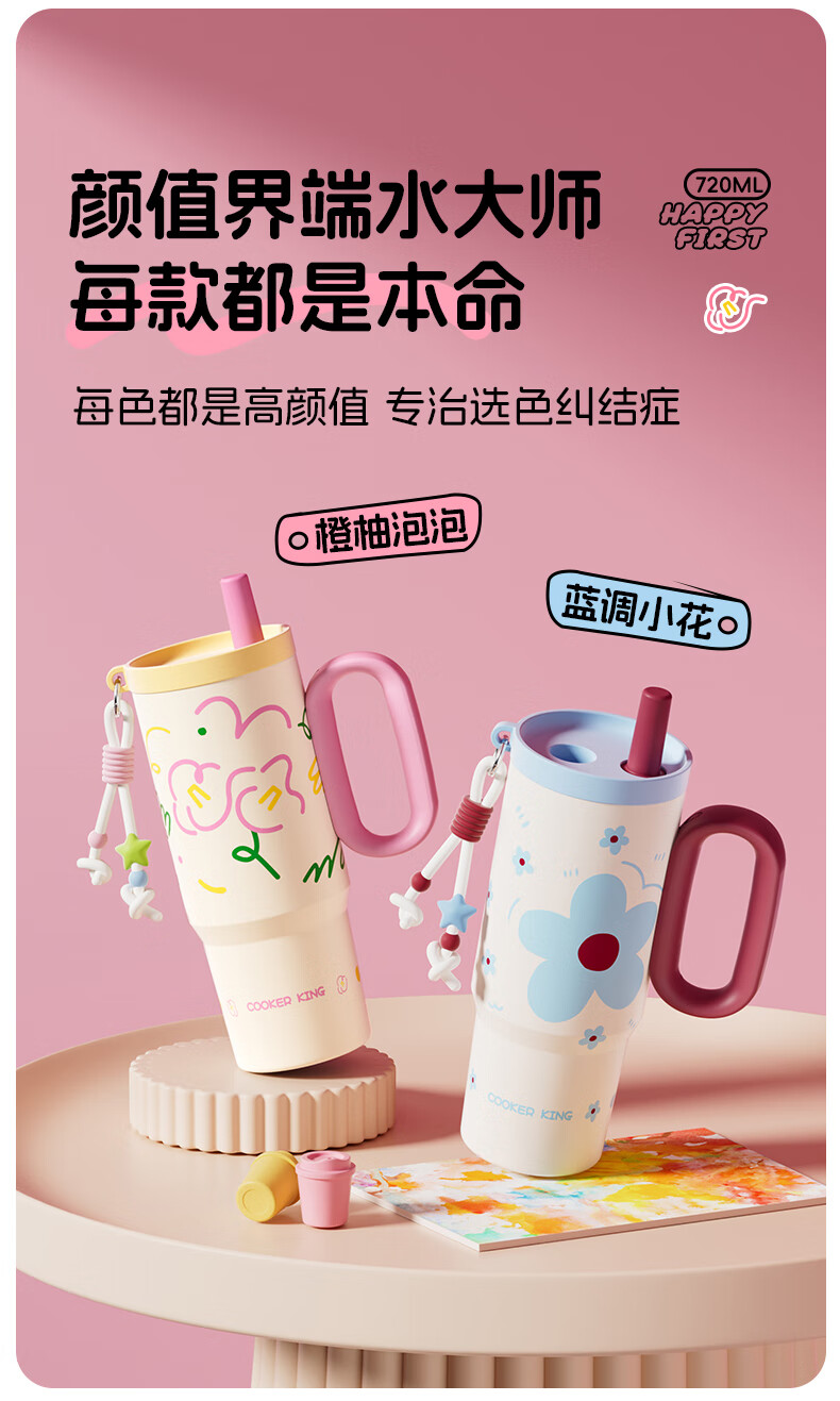 炊大皇 316不锈钢冰霸杯保温杯大容量女生高颜值水杯 MS72B3橙柚泡泡 720ml 混色(单位:个)