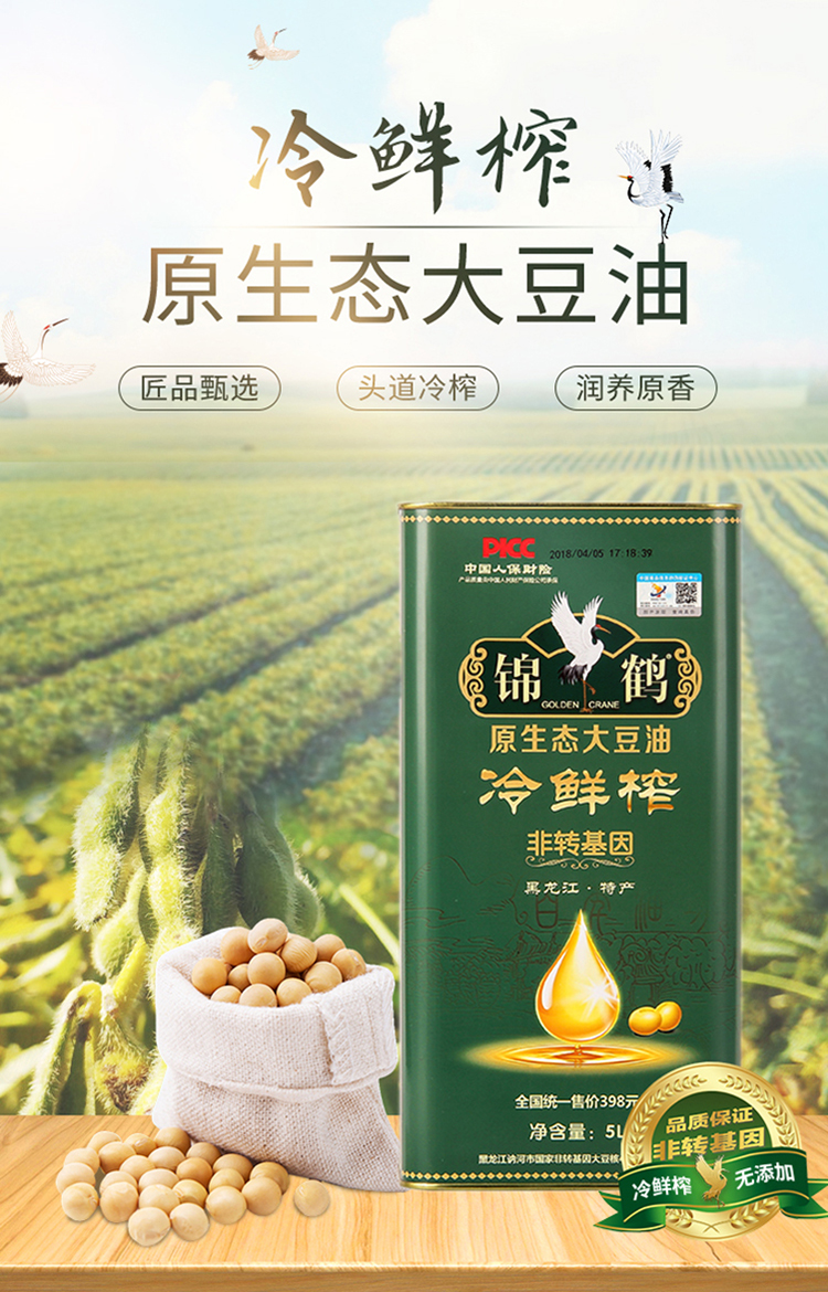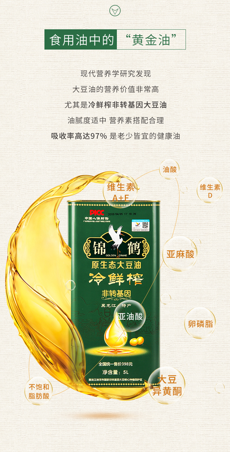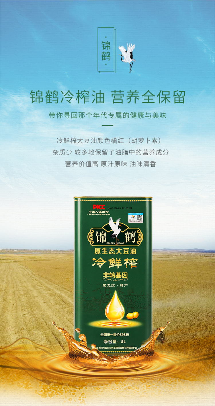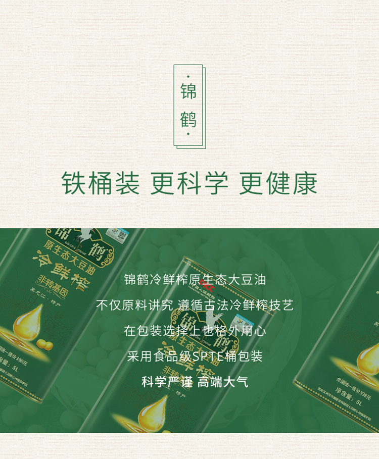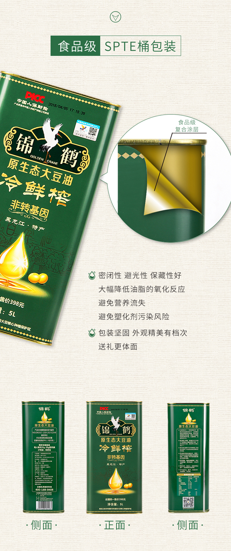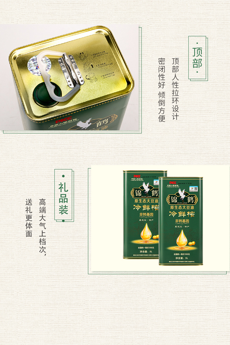 锦鹤 东北黑龙江头道初榨冷鲜榨大豆油 铁桶装 高品质 5L 橄榄绿(单位:桶)