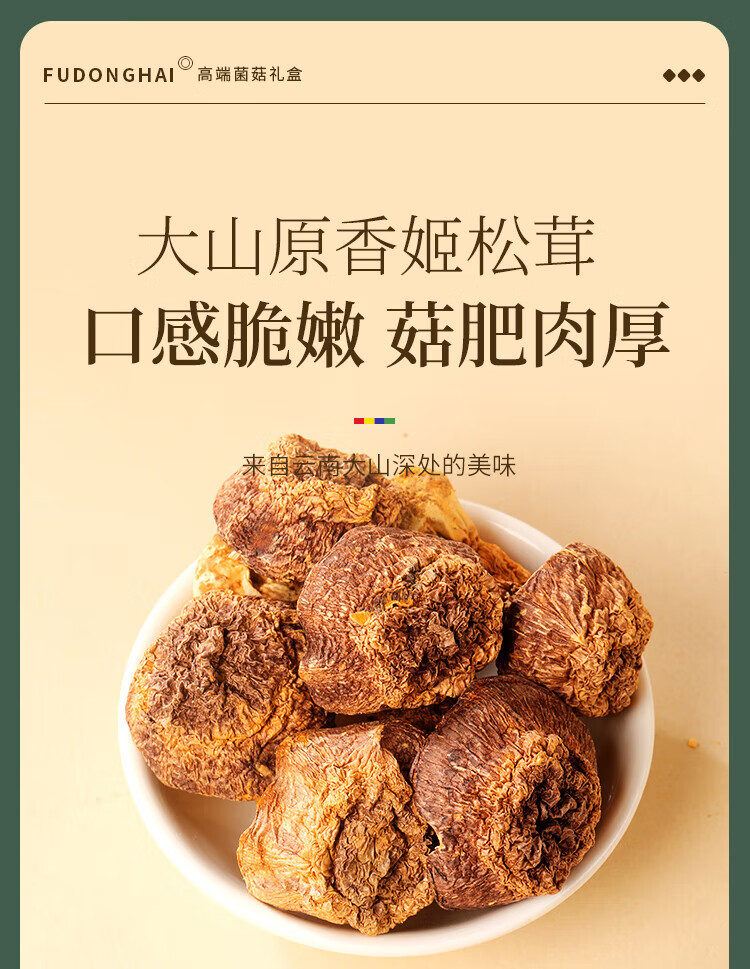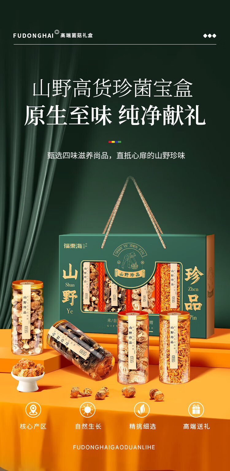 福东海(fudonghai) 山珍菌菇礼盒 (羊肚菌50克、姬松茸100克、花菇150克、虫草花100克) 400克 雾雨绿(单位:盒)