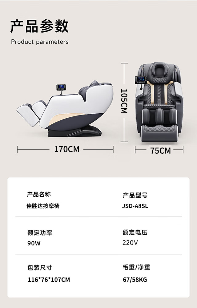 佳胜达(JSD) 机械手全自动按摩椅太空豪华舱 JSD-A8SL 116*76*107cm 白灰色(单位:台)