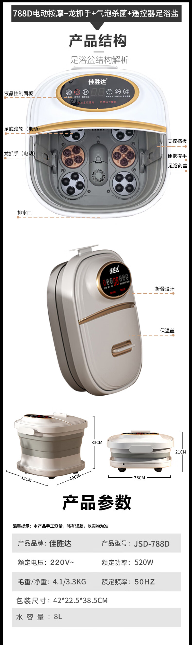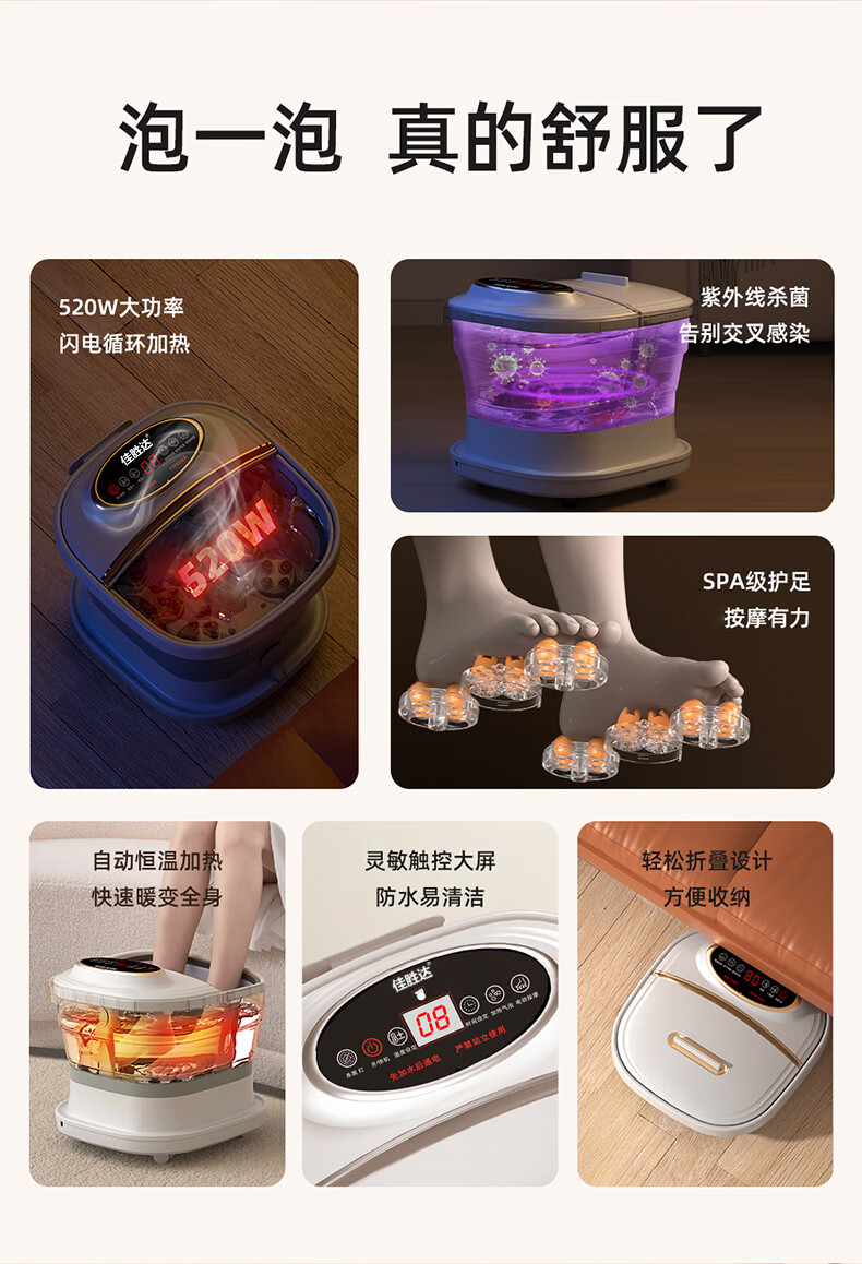 佳胜达(JSD) 折叠电动按摩足浴盆恒温加热 JSD-788D 520W 米白色(单位:台)