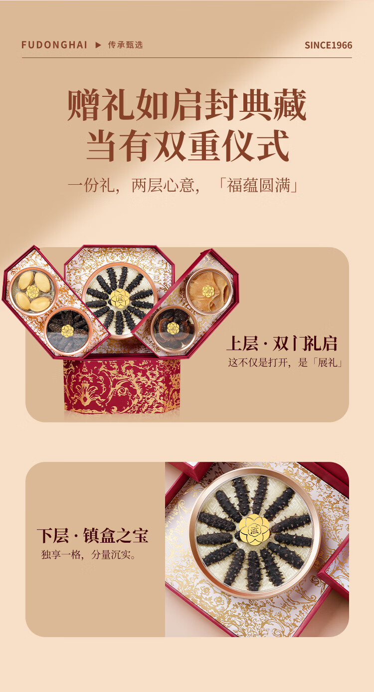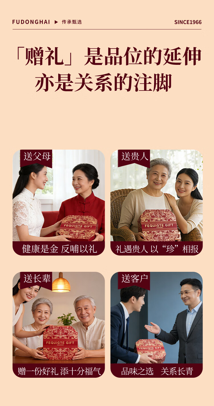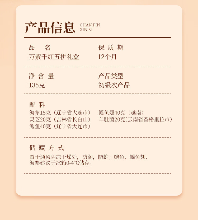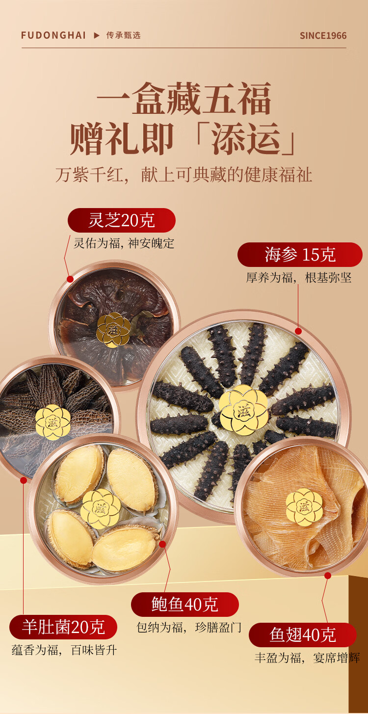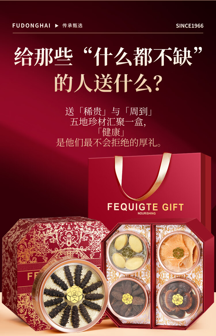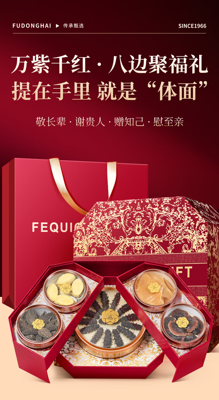 福东海(fudonghai) 海参鲍鱼鱼翅羊肚菌灵芝滋补品 万紫千红五拼礼盒-E 135克 红色(单位:盒)