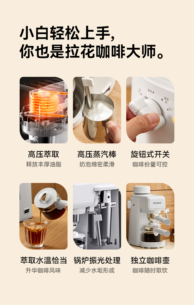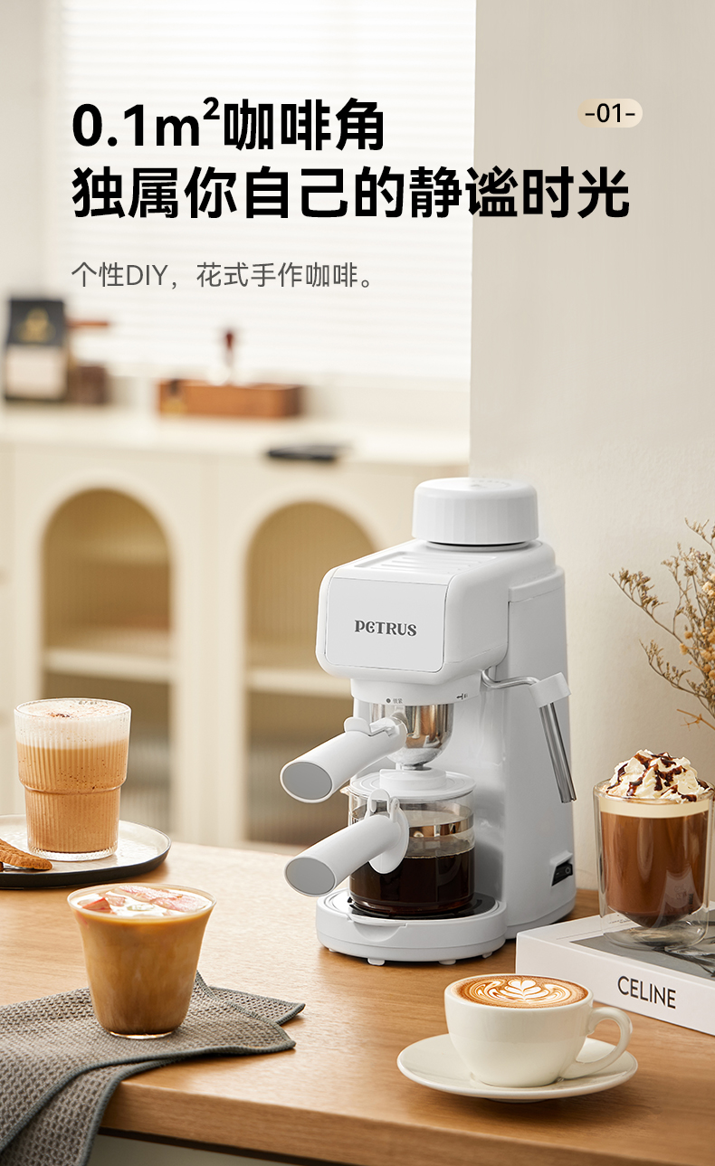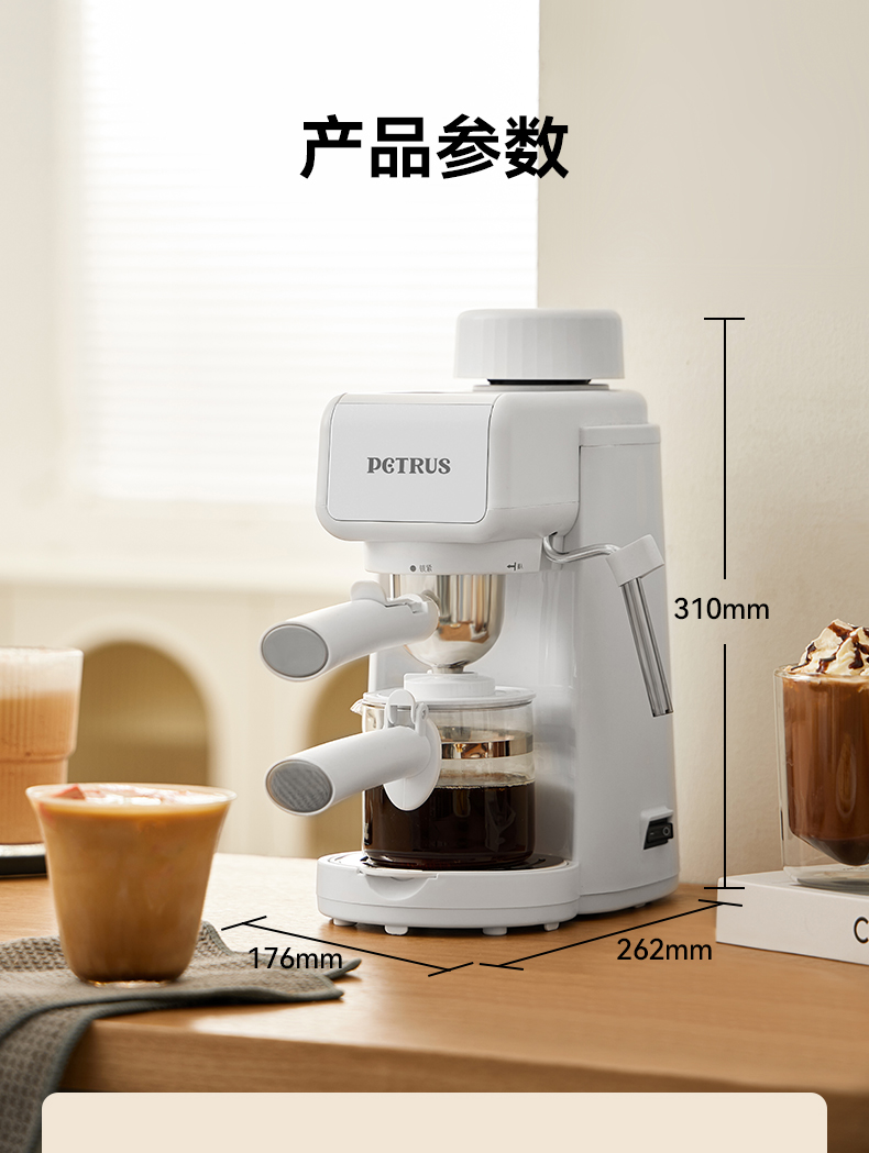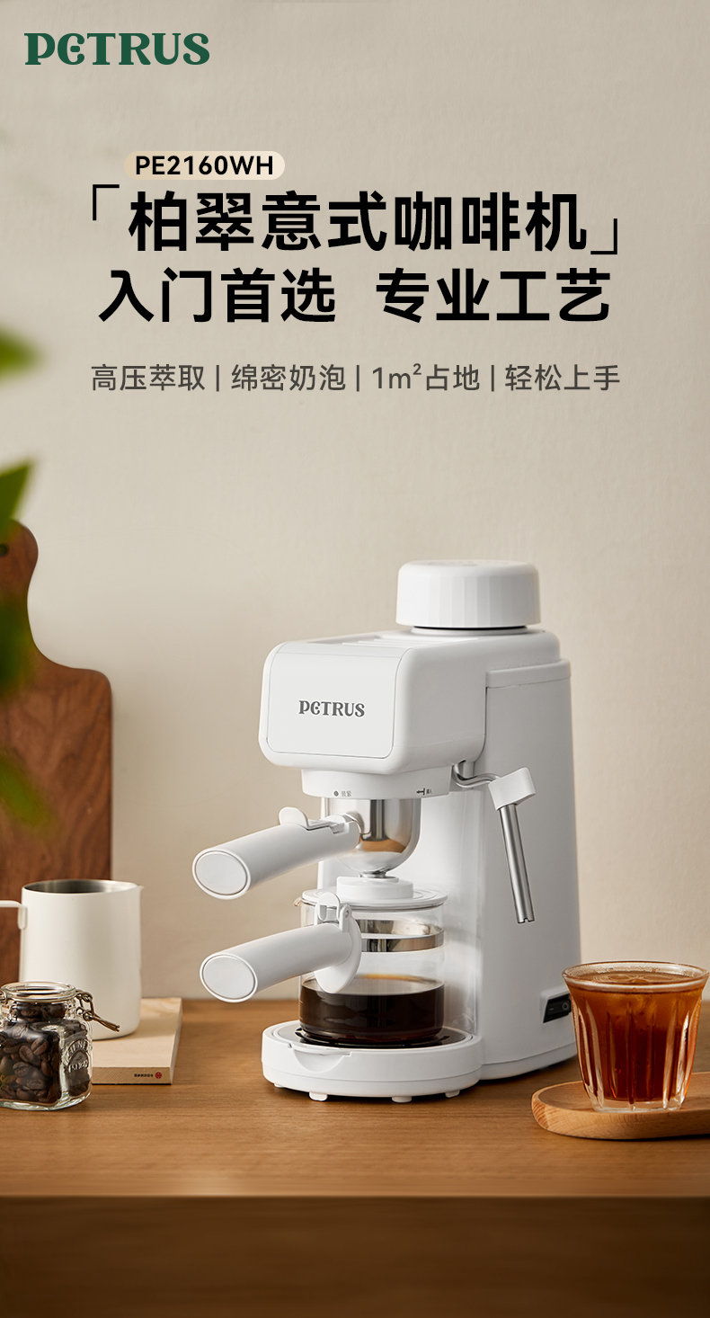 柏翠(petrus) 咖啡机 PE2160WH 800W功率,0.24L容量意式压力半自动一体 白色(单位:台)