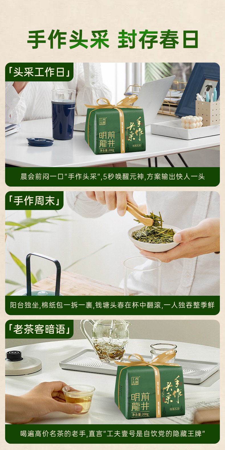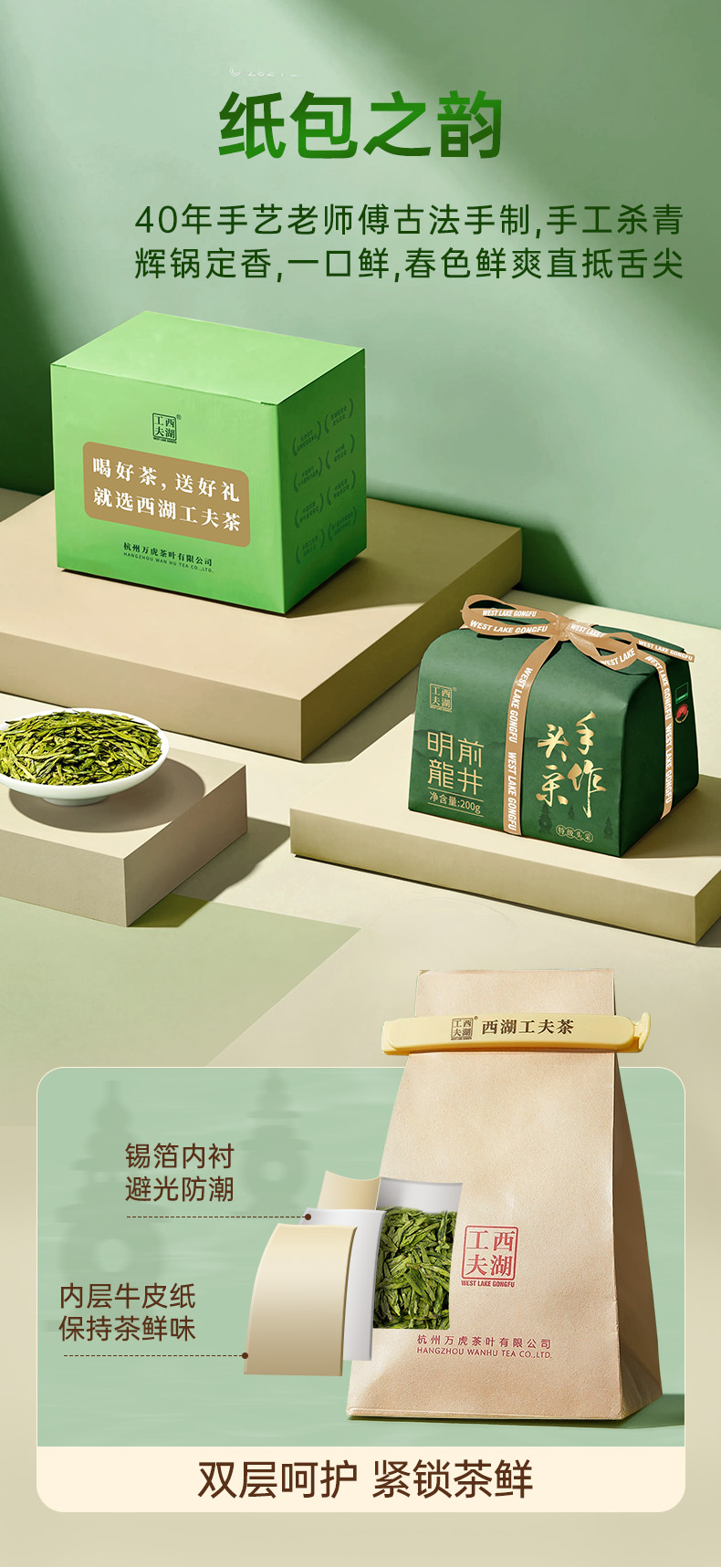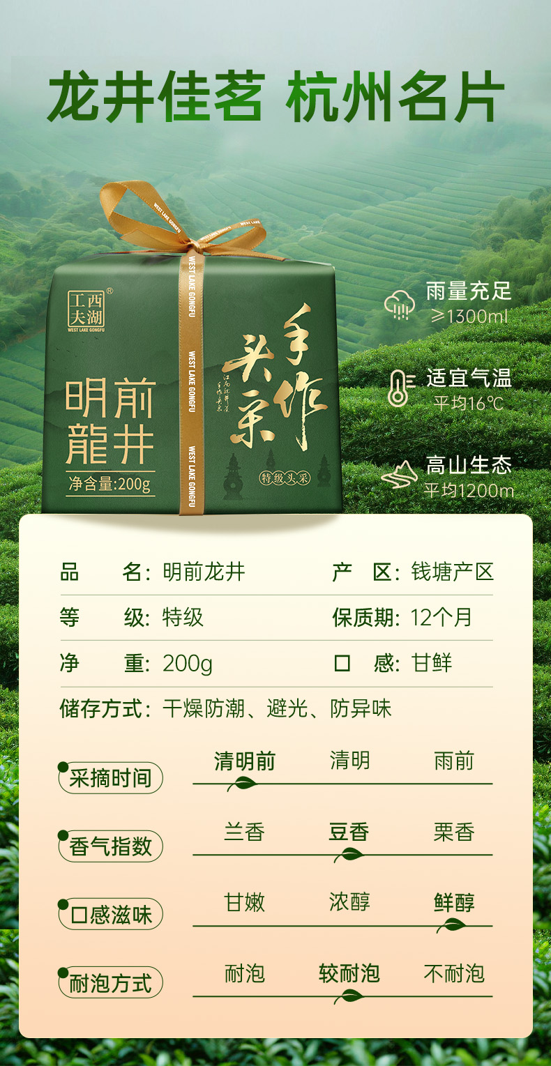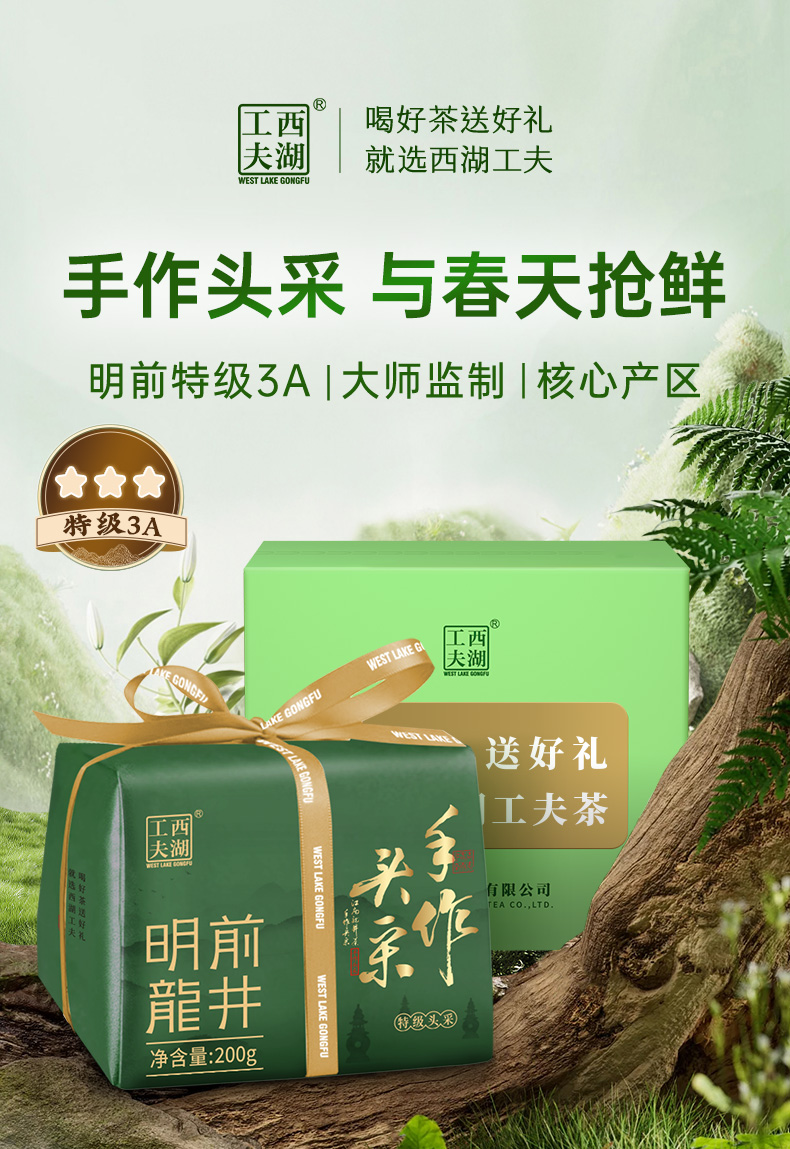 西湖工夫 手作头采龙井 明前特级 200g/盒 浅杉绿(单位:盒)