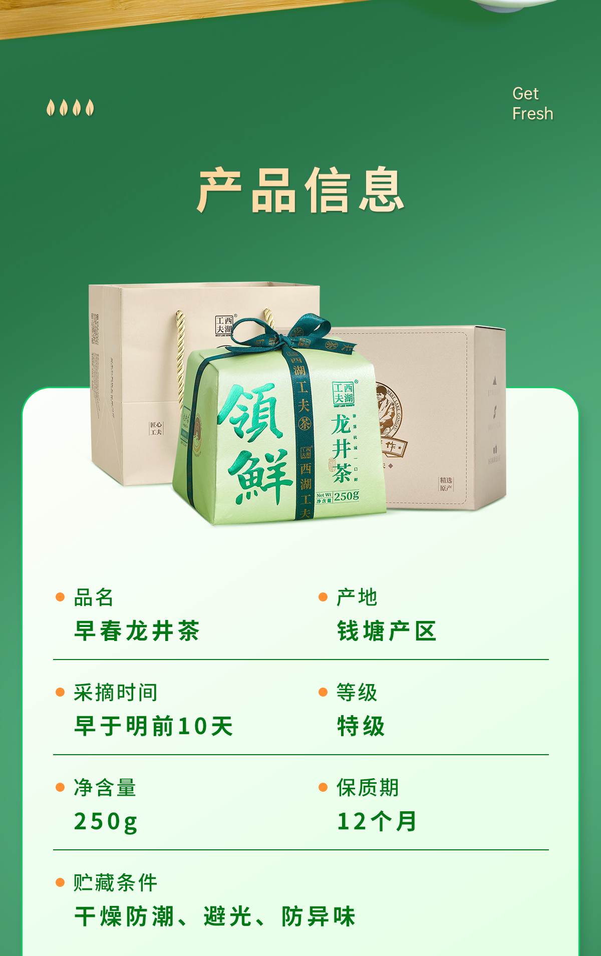 西湖工夫 领鲜龙井 特级 250g/盒 雾雨绿(单位:盒)