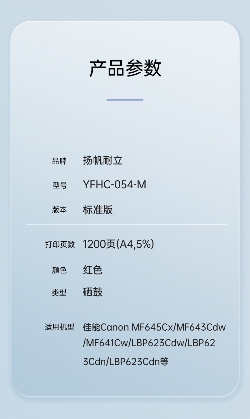 扬帆耐立(YFHC) YFHC-054-M 标准版 打印量1200页 适用机型:佳能CanonMF645Cx 硒鼓 1.00 只/个 (计价单位:个) 红色