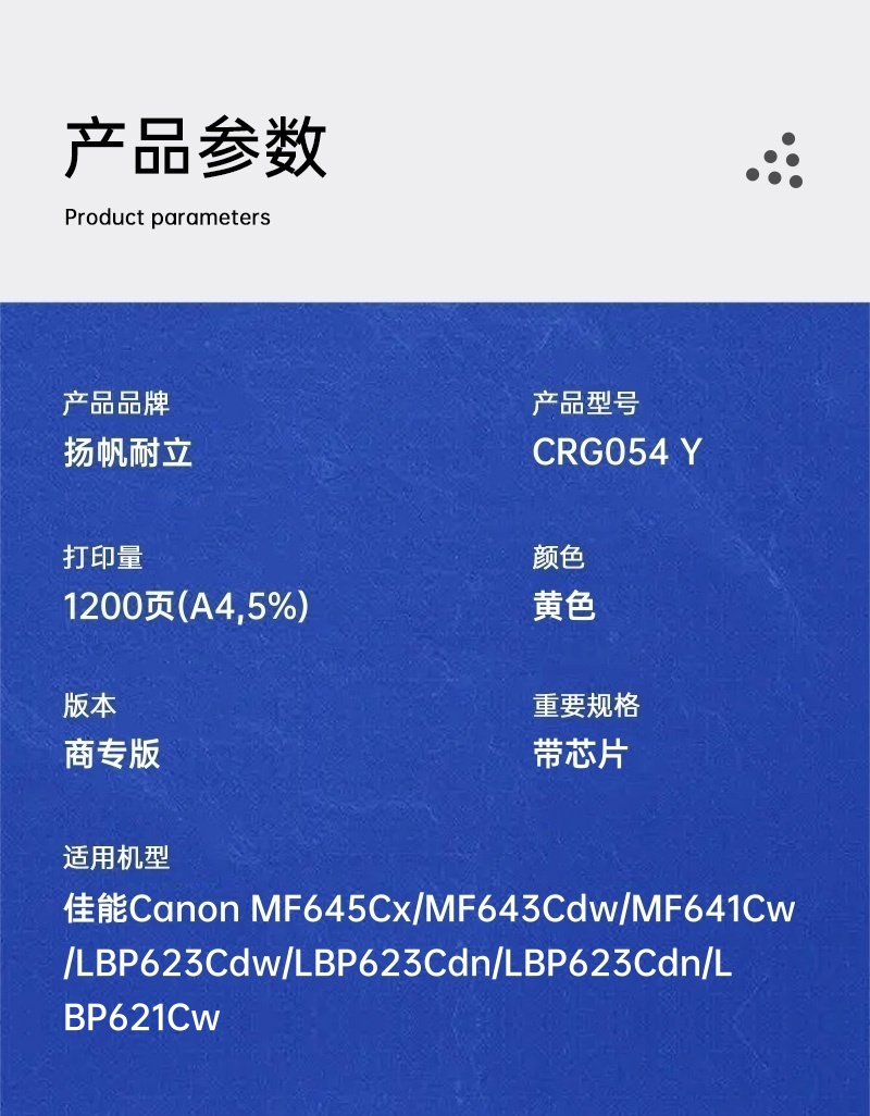 扬帆耐立(YFHC) YFHC-054-Y 标准版 打印量1200页 适用机型:佳能CanonMF645Cx 硒鼓 1.00 只/个 (计价单位:个) 黄色