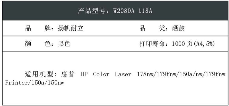 扬帆耐立(YFHC) YFHC-W2080A-B-RE 1000页 硒鼓 (计价单位:个) 黑色 黑色