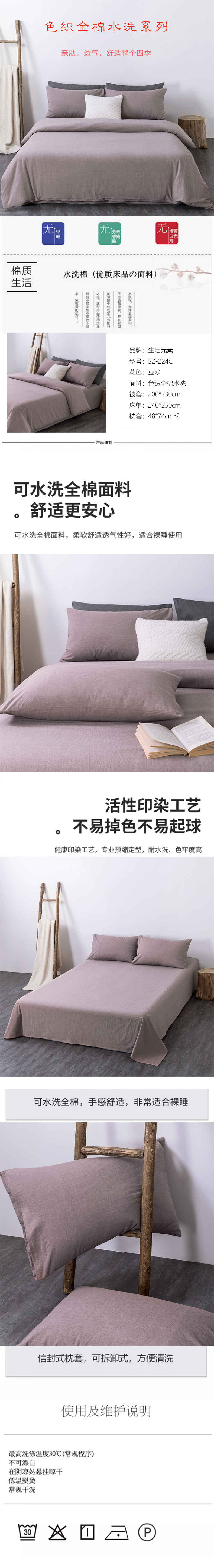生活元素(shenghuoyuansu) 豆沙色织全棉水洗四件套 SZ-224C被套:200*230cm 豆沙色