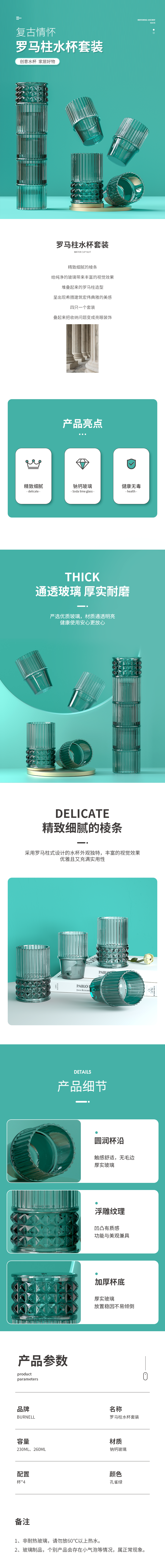 巴米乐(BURNELL) 罗马柱水杯套装 BNL-L010 230mL、260mL 孔雀绿(单位:套)