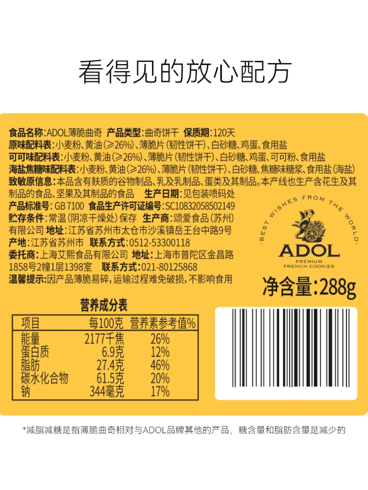 ADOL 薄脆曲奇 饼干 288g 鹅仔黄(单位:盒)