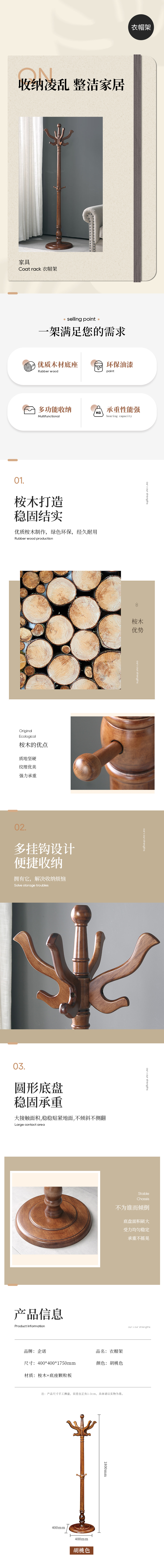 企诺 衣帽架挂衣架 QY391 400*400*1750mm 胡桃色(单位:个)